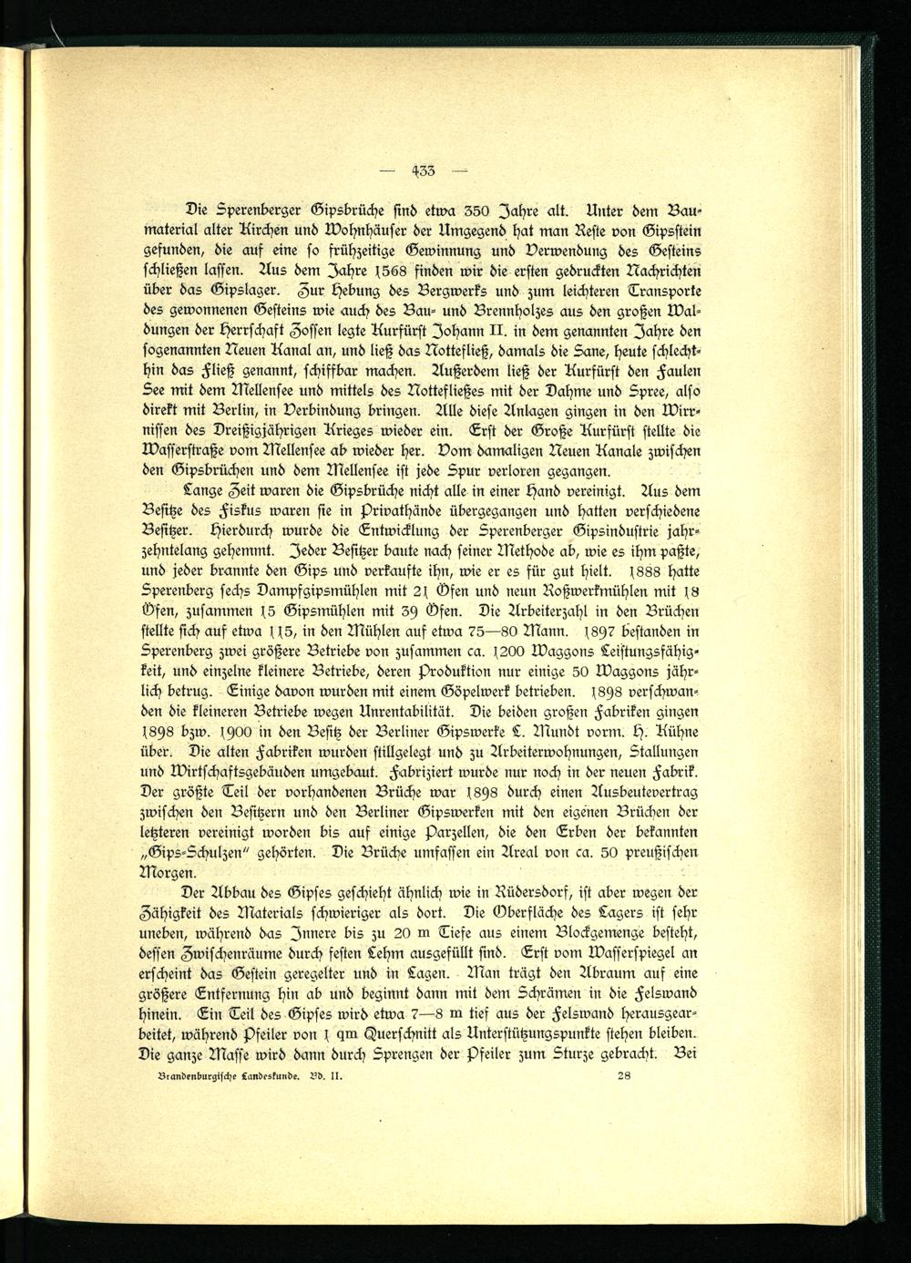 Lange Zeit waren die Gipsbrüche nicht alle in einer Hand vereinigt. Aus dem Besitze des Fiskus waren sie in Privathände übergegangen und hatten verschiedene Besitzer, hierdurch wurde die Entwicklung der Sperenberger Gipsindustrie jahrzehntelang gehemmt. Jeder Besitzer baute nach seiner Nlethode ab, wie es ihm paßte, und jeder brannte den Gips und verkaufte ihn, wie er es für gut hielt. 1888 hatte Sperenberg sechs Dampfgipsmühlen mit 2f Ofen und neun Roßwerkmühlen mit 18 Ofen, zusammen 15 Gipsmühlen mit 39 Ofen. Die Arbeiterzahl in den Brüchen stellte sich auf etwa 115, in den Nlühlen auf etwa 75—80 Nlann. 189? bestanden in Sperenberg zwei größere Betriebe von zusammen ca. 1200 Waggons Leistungsfähigkeit, und einzelne kleinere Betriebe, deren Produktion nur einige 50 Waggons jährlich betrug. Einige davon wurden mit einem Göpelwerk betrieben. I898 verschwanden die kleineren Betriebe wegen Unrentabilität. Die beiden großen Fabriken gingen I898 bzw. 1900 in den Besitz der Berliner Gipswerke L. Nlundt vorm. h. Kühne über. Die alten Fabriken wurden stillgelegt und zu Arbeiterwohnungen, Stallungen und Wirtschaftsgebäuden umgebaut. Fabriziert wurde nur noch in der neuen Fabrik. Der größte Teil der vorhandenen Brüche war I898 durch einen Ausbeutevertrag zwischen den Besitzern und den Berliner Gipswerken mit den eigenen Brüchen der letzteren vereinigt worden bis auf einige Parzellen, die den Erben der bekannten „Gips-Schulzen" gehörten. Die Brüche umfassen ein Areal von ca. 50 preußischen Nlorgen.
