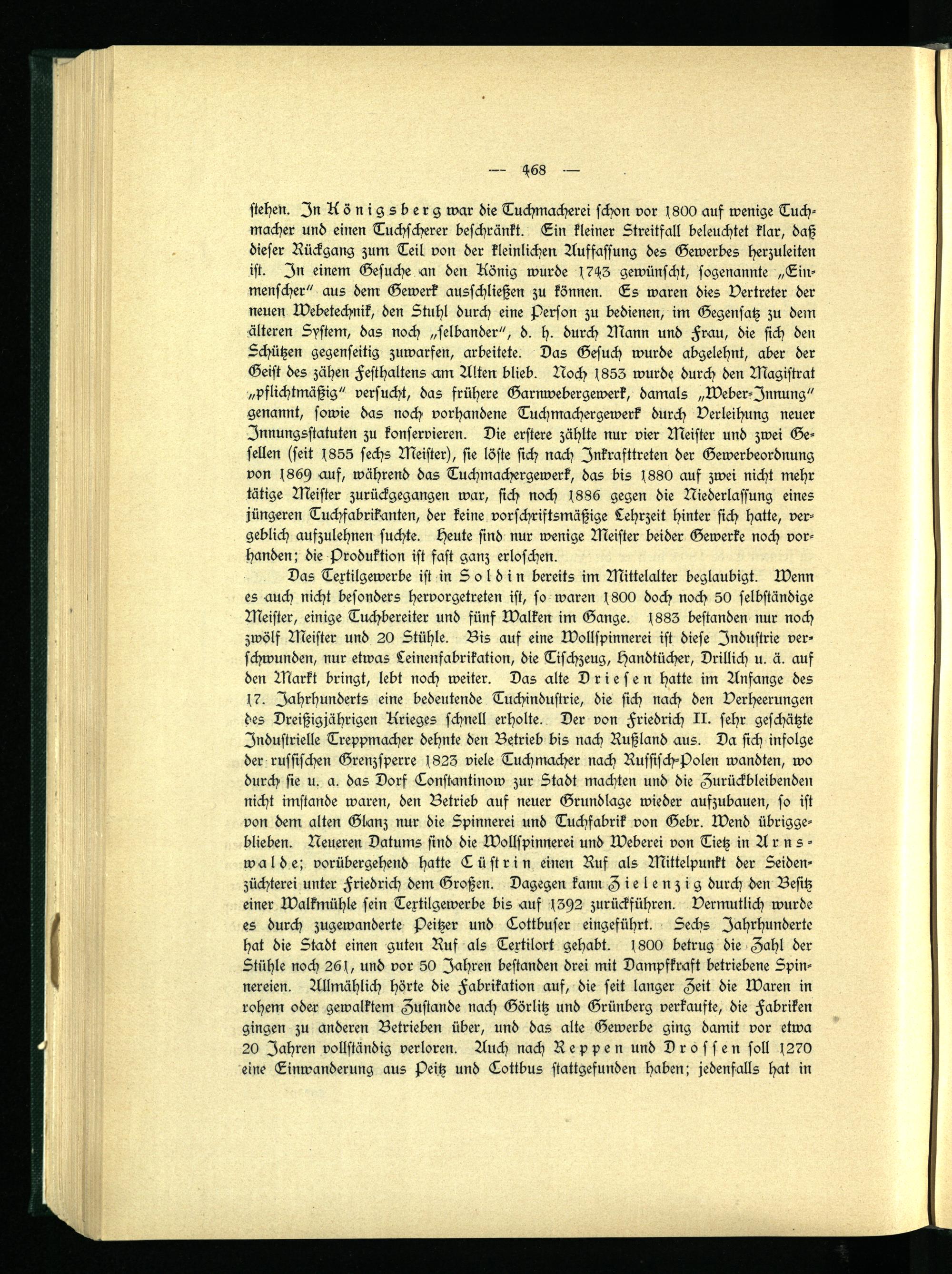 Das Textilgewerbe ist in Soldin bereits im Mittelalter beglaubigt. Menn es auch nicht besonders hervorgetreten ist, so waren j800 doch noch 50 selbständige Meister, einige Tuchbereiter und fünf Malten im Gange. j883 bestanden nur noch zwölf Meister und 20 Stühle. Bis auf eine Mollspinnerei ist diese Industrie verschwunden, nur etwas Leinenfabrikation, die Tischzeug, Handtücher, Drillich u. ä. auf den Markt bringt, lebt noch weiter. Das alte Driesen hatte im Anfänge des s7. Jahrhunderts eine bedeutende Tuchindustrie, die sich nach den Verheerungen des Dreißigjährigen Krieges schnell erholte. Der von Friedrich II. sehr geschätzte Industrielle Treppmacher dehnte den Betrieb bis nach Rußland aus. Da sich infolge der russischen Grenzsperre s823 viele Tuchmacher nach Russisch-Polen wandten, wo durch sie u. a. das Dorf Tonstantinow zur Stadt machten und die Zurückbleibenden nicht imstande waren, den Betrieb auf neuer Grundlage wieder aufzubauen, so ist von dem alten Glanz nur die Spinnerei und Tuchfabrik von Gebr. Mend übriggeblieben. Neueren Datums sind die Mollspinnerei und Meberei von Tietz in Arns- wal de; vorübergehend hatte Tüstrin einen Ruf als Mittelpunkt der Seidenzüchterei unter Friedrich dem Großen. Dagegen kann Zielenzig durch den Besitz einer Malkmühle sein Textilgewerbe bis auf 1592 zurückführen. Vermutlich wurde es durch zugewanderte peitzer und Tottbuser eingeführt. Sechs Jahrhunderte hat die Stadt einen guten Ruf als Textilort gehabt. f800 betrug die Zahl der Stühle noch 26 f, und vor 50 Jahren bestanden drei mit Dampfkraft betriebene Spinnereien. Allmählich hörte die Fabrikation auf, die seit langer Zeit die Maren in rohem oder gewalktem Zustande nach Görlitz und Grünberg verkaufte, die Fabriken gingen zu anderen Betrieben über, und das alte Gewerbe ging damit vor etwa 20 Jahren vollständig verloren. Auch nach Reppen und Drossen soll s270 eine Einwanderung aus peitz und Tottbus stattgefunden haben; jedenfalls hat in