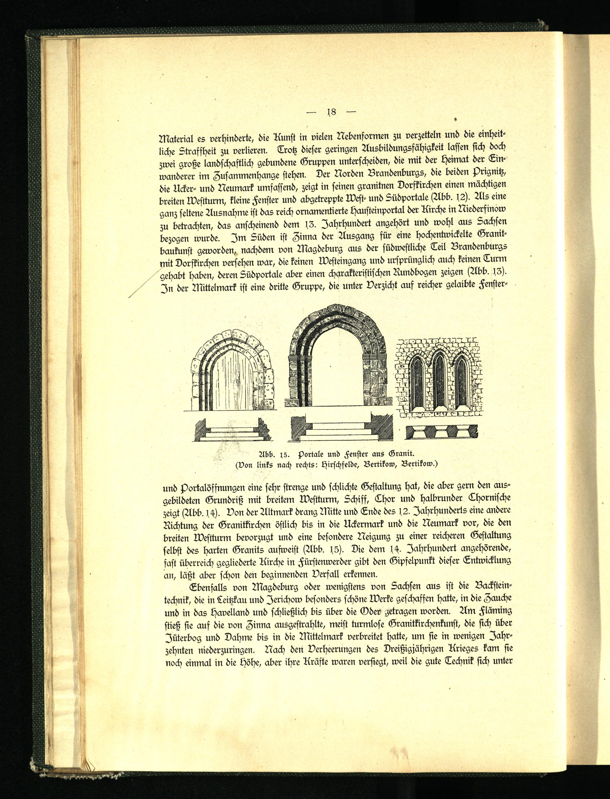 Material es verhinderte, die Kunst in vielen Nebenformen zu verzetteln und die einheitliche Straffheit zu verlieren. Trotz dieser geringen Ausbildungsfähigkeit lassen sich doch zwei große landschaftlich gebundene Gruppen unterscheiden, die mit der Heimat der Einwanderer im Zusammenhänge stehen. Der Norden Brandenburgs, die beiden s)rignitz, die Ucker- und Neumark umfassend, zeigt in seinen granitnen Dorfkirchen einen mächtigen breiten Westturm, kleine Fenster und abgetreppte West- und Südportale (Abb. 12). Als eine ganz seltene Ausnahme ist das reich ornamentierte Hausteinportal der Airche in Niedersinow zu betrachten, das anscheinend dem 1 . 3 . Jahrhundert angehört und wohl aus Sachsen bezogen wurde. Zm Süden ist Zinna der Ausgang für eine hochentwickelte Granitbaukunst geworden, nachdem von Magdeburg aus der südwestliche Teil Brandenburgs mit Dorfkirchen versehen war, die keinen Westeingang und ursprünglich auch keinen Turm gehabt haben, deren Südportale aber einen charakteristischen Rundbogen zeigen (Abb. 1 3) . In der Mittelmark ist eine dritte Gruppe, die unter Verzicht auf reicher gelaibte Fenster-