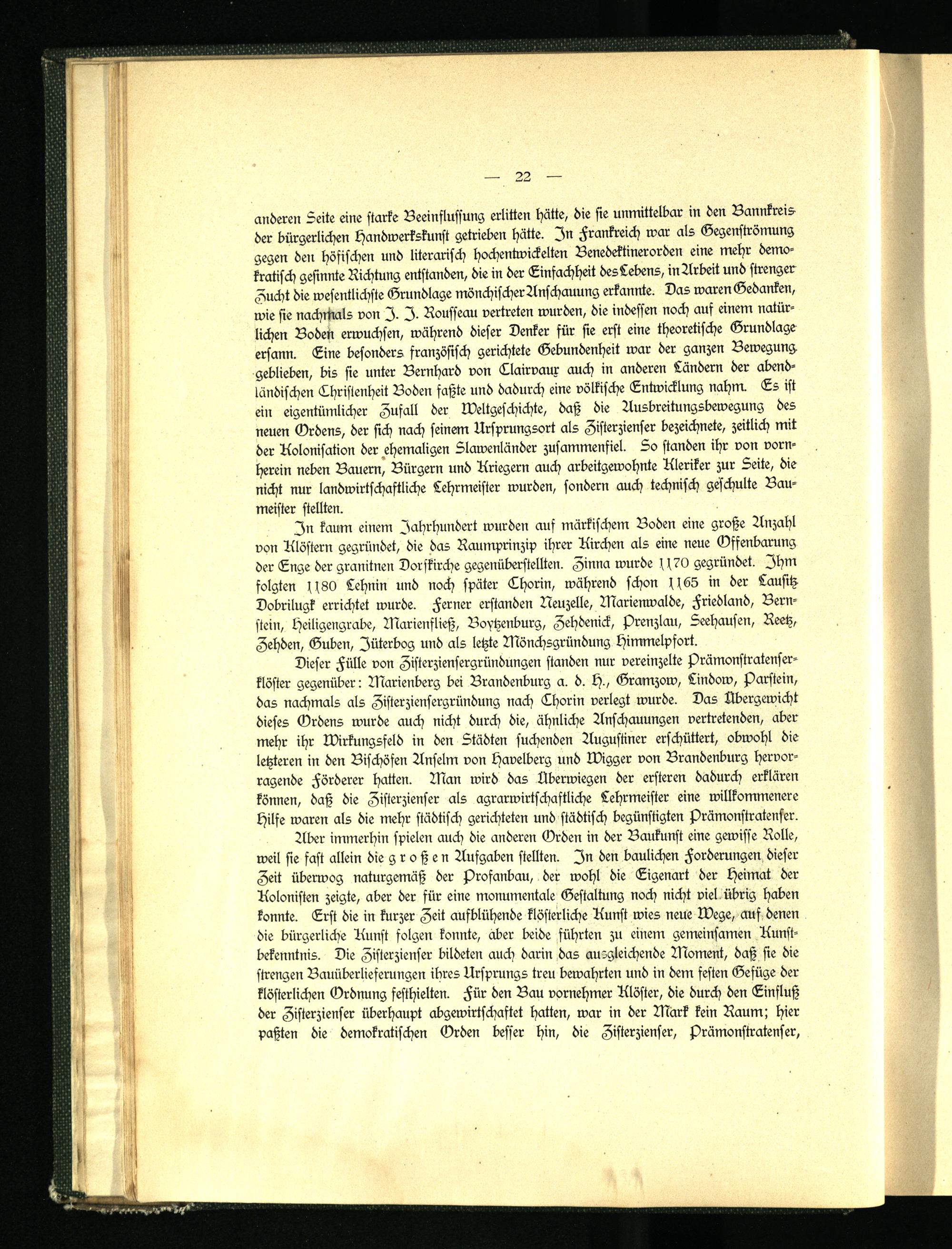 anderen Seite eine starke Beeinflussung erlitten hätte, die sie unmittelbar in den Bannkreis der bürgerlichen Handwerkskunst getrieben hätte. In Frankreich war als Gegenströmung gegen den höfischen und literarisch hochentwickelten Benedektinerorden eine mehr demokratisch gesinnte Richtung entstanden, die in der Einfachheit desLebens, in Arbeit und strenger Zucht die wesentlichste Grundlage mönchischerAnschauung erkannte. Das waren Gedanken, wie sie nachrttals von J. J. Rousseau vertreten wurden, die indessen noch auf einem natürlichen Bodett erwuchsen, während dieser Denker für sie erst eine theoretische Grundlage ersann. Line besonders französisch gerichtete Gebundenheit war der ganzen Bewegung, geblieben, bis sie unter Bernhard von Clairvaux auch in anderen Ländern der abendländischen Christenheit Boden faßte und dadurch eine völkische Entwicklung nahm. Es ist ein eigentümlicher Zufall der Weltgeschichte, daß die Ausbreitungsbewegung des neuen Ordens, der sich nach seinem Ursprungsort als Zisterzienser bezeichnete, zeitlich mit der Kolonisation der ehemaligen Slawenländer zusammenfiel. So standen ihr von vornherein neben Bauern, Bürgern und Kriegern auch arbeitgewohnte Kleriker zur Seite, die nicht nur landwirtschaftliche Lehrmeister wurden, sondern auch technisch geschulte Baumeister stellten.