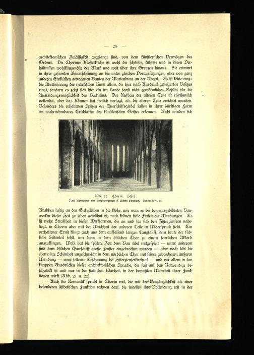 Krabben lustig an den Giebelleisten in die höhe, wie man es bei den ausgebildeten Bauwerken dieser Zeit zu sehen gewöhnt ist, noch krönen steile Fialen die Wandungen. Es ist mehr Straffheit in diesen Werkformen, die an und für sich den Zisterziensern naheliegt, in Chorin aber mit der Weichheit der anderen Teile in Widerspruch steht. Ein verhaltener Ernst klingt auch aus dem auffallend langen Langschiff, dem heute der südliche Seitenteil fehlt, um dann in dem östlichen Thor zu einem feierlichen Akkord auszuklingen. Wohl hat die spätere Zeit dem Bau übel mitgespielt — unter anderem sind dem östlichen Querschiff große Fenster eingebrochen worden — aber noch lebt die ehemalige Schönheit ungeschwächt in dem nördlichen Thor mit seiner gebrochenen äußeren Wandung — einer seltenen Erscheinung bei Zisterzienserkirchen! — und vor allem in den knappen Ausdrücken dieser architektonischen Sprache, die fast auf das Notwendige beschränkt ist und nur in der statischen Klarheit, in der bewußten Wahrheit ihrer Funktionen wirkt (Abb. 2s u. 22).