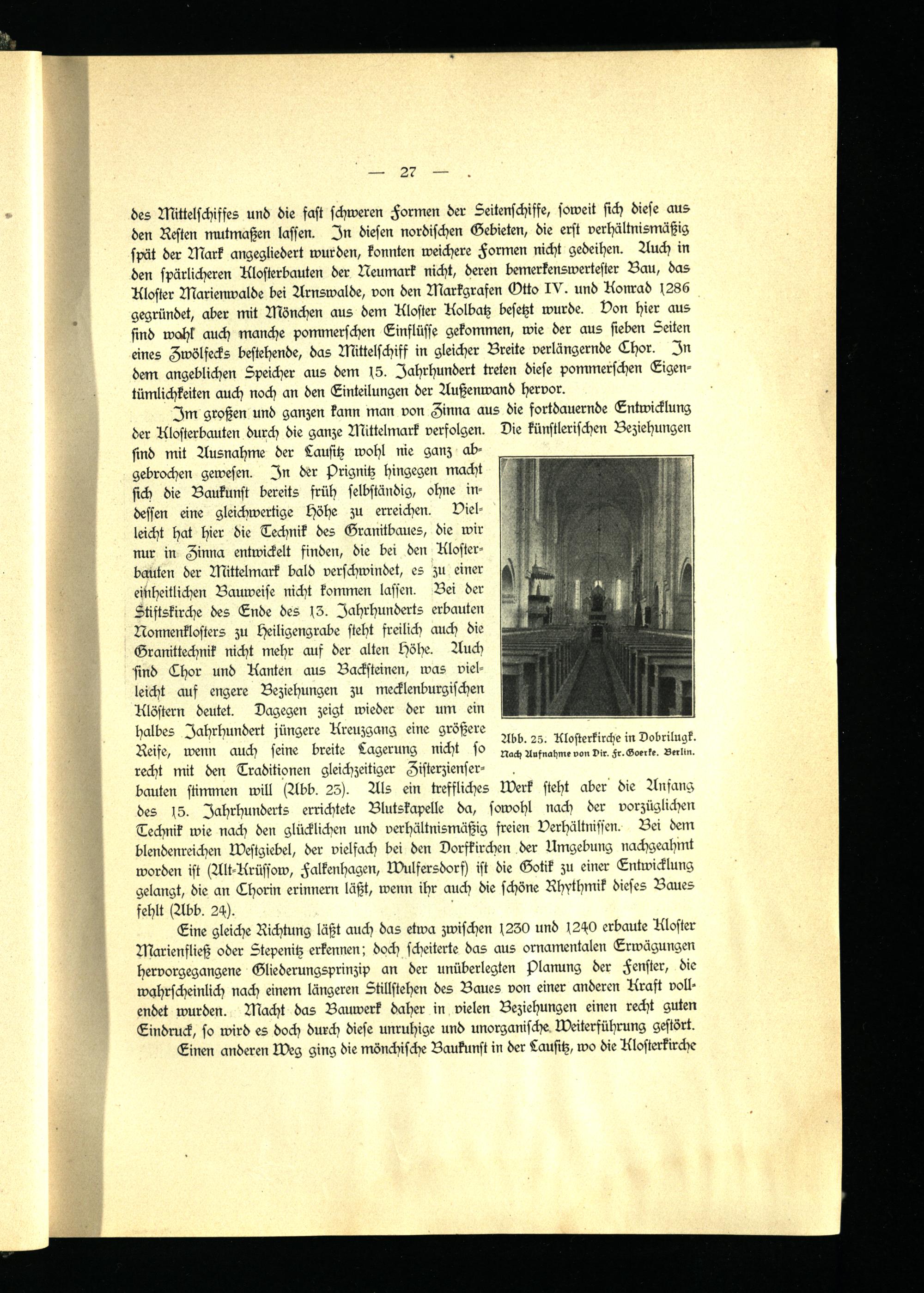 Im großen und ganzen kann man von Zinna aus die fortdauernde Entwicklung der Klosterbauten durch die ganze Mittelmark verfolgen. Die künstlerischen Beziehungen sind mit Ausnahme der Lausitz wohl nie ganz abgebrochen gewesen. In der Prignitz hingegen macht sich die Baukunst bereits früh selbständig, ohne indessen eine gleichwertige höhe zu erreichen. Vielleicht hat hier die Technik des Granitbaues, die wir nur in Zinna entwickelt finden, die bei den Kloster- bauten der Mittelmark bald verschwindet, es zu einer einheitlichen Bauweise nicht kommen lassen. Bei der Stiftskirche des Ende des s3. Jahrhunderts erbauten Nonnenklosters zu heiligengrabe steht freilich auch die Granittechnik nicht mehr auf der alten höhe. Auch sind Thor und Rauten aus Backsteinen, was vielleicht auf engere Beziehungen zu mecklenburgischen Klöstern deutet. Dagegen zeigt wieder der um ein halbes Jahrhundert jüngere Kreuzgang eine größere Reife, wenn auch seine breite Lagerung nicht so recht mit den Traditionen gleichzeitiger Zisterzienserbauten stimmen will (Abb. 25). Als ein treffliches Merk steht aber die Anfang des 15. Jahrhunderts errichtete Blutskapelle da, sowohl nach der vorzüglichen Technik wie nach den glücklichen und verhältnismäßig freien Verhältnissen. Bei dem blendenreichen Westgiebel, der vielfach bei den Dorfkirchen der Umgebung nachgeahmt worden ist (Alt-Krüssow, Falkenhagen, Wulfersdorf) ist die Gotik zu einer Entwicklung gelangt, die an Thorin erinnern läßt, wenn ihr auch die schöne Rhythmik dieses Baues fehlt (Abb. 24).