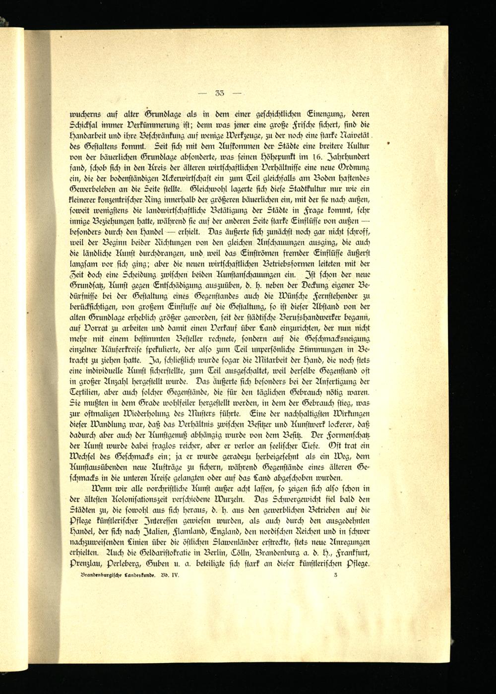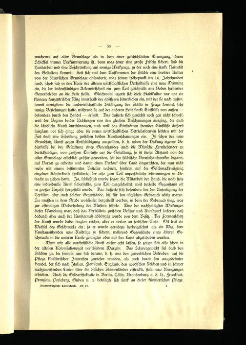 Wenn wir alle vorchristliche Kunst außer acht lassen, so zeigen sich also schon in der ältesten Kolonisationszeit verschiedene Wurzeln. Das Schwergewicht fiel bald den Städten zu, die sowohl aus sich heraus, d. h. aus den gewerblichen Betrieben auf die pflege künstlerischer Interessen gewiesen wurden, als auch durch den ausgedehnten Handel, der sich nach Italien, Flamland, England, den nordischen Reichen und in schwer nachzuweisenden Linien über die östlichen Slawenländer erstreckte, stets neue Anregungen erhielten. Auch die Geldaristokratie in Berlin, Tölln, Brandenburg a. d. H., Frankfurt, Prenzlau, Perleberg, Guben u. a. beteiligte sich stark an dieser künstlerischen Pflege,