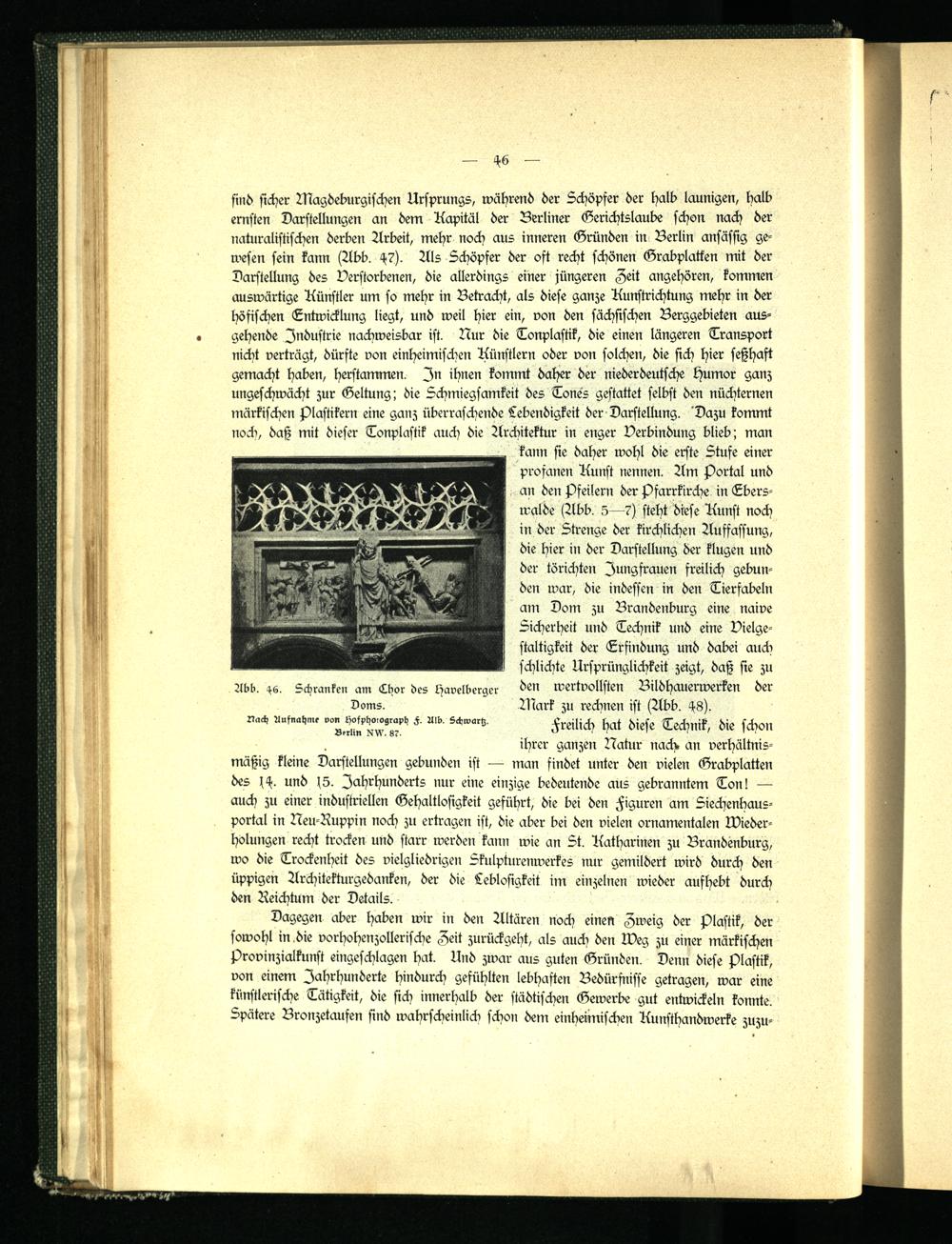 kann sie daher wohl die erste Stufe einer profanen Kunst nennen. Am Portal und an den Pfeilern der Pfarrkirche in Eberswalde (Abb. 5—7) steht diese Kunst noch in der Strenge der kirchlichen Auffassung, die hier in der Darstellung der klugen und der törichten Jungfrauen freilich gebunden war, die indessen in den Tierfabeln am Dom zu Brandenburg eine naive Sicherheit und Technik und eine Vielgestaltigkeit der Erfindung und dabei auch schlichte Ursprünglichkeit zeigt, daß sie zu Abb. 46. Schranken am Chor des Havelberger d en wertvollsten Bildhauerwerken der Doms. Mark zu rechnen ist (Abb. 4 8).