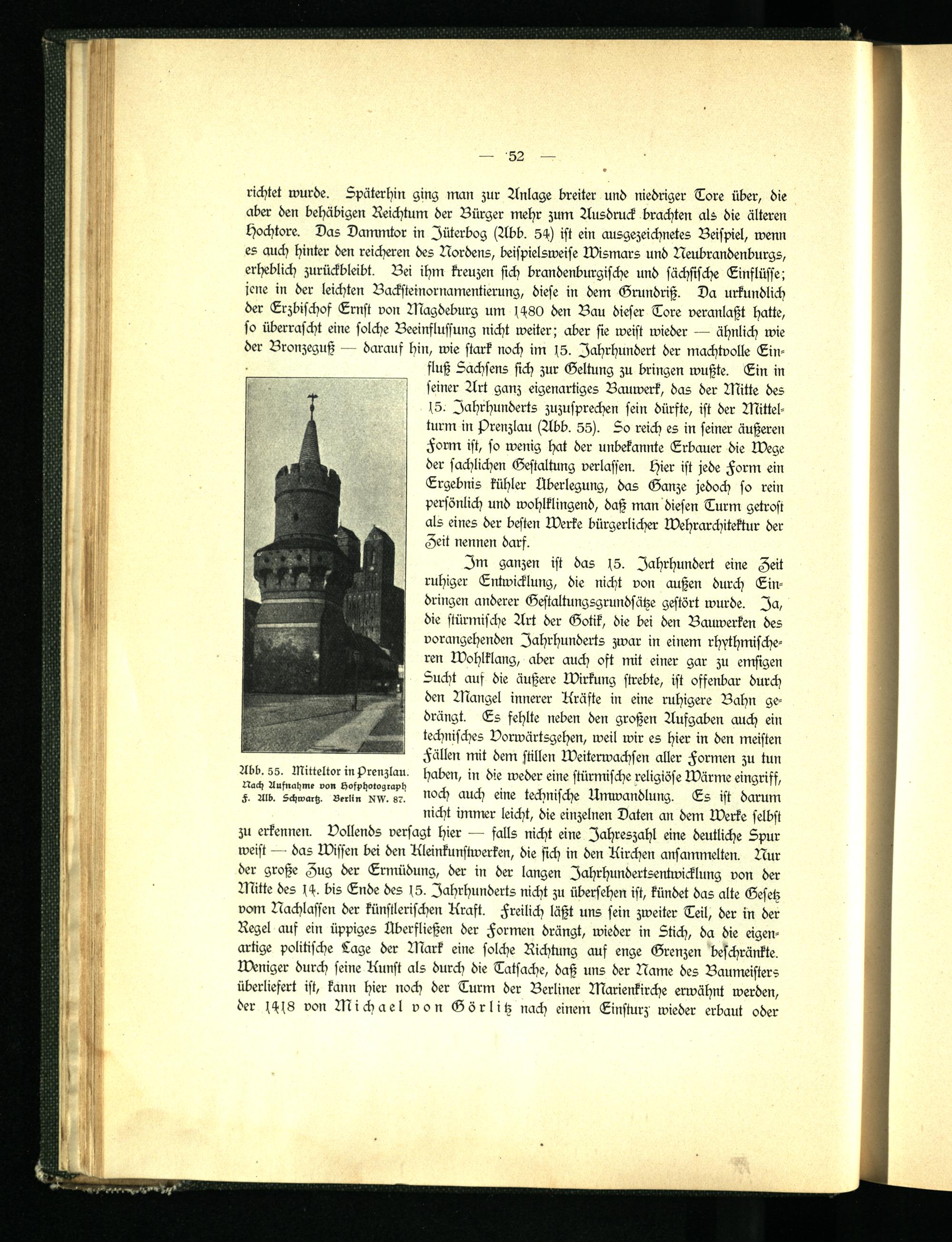 Im ganzen ist das 15. Jahrhundert eine Zeit ruhiger Entwicklung, die nicht von außen durch Eindringen anderer Gestaltungsgrundsätze gestört wurde. Ja, die stürmische Art der Gotik, die bei den Bauwerken des vorangehenden Jahrhunderts zwar in einem rhythmischeren Wohlklang, aber auch oft mit einer gar zu emsigen Sucht auf die äußere Wirkung strebte, ist offenbar durch den Mangel innerer Kräfte in eine ruhigere Bahn gedrängt. Es fehlte neben den großen Aufgaben auch ein technisches Vorwärtsgehen, weil wir es hier in den meisten Fällen mit dem stillen Weiterwachsen aller Formen zu tun Abb. 55. Mitteltor in Prenzlau. haben, in die weder eine stürmische religiöse Wärme eingriff, F. Alb. Schwartz"°B»ttn^v.'^ noch auch eine technische Umwandlung. Es ist darum