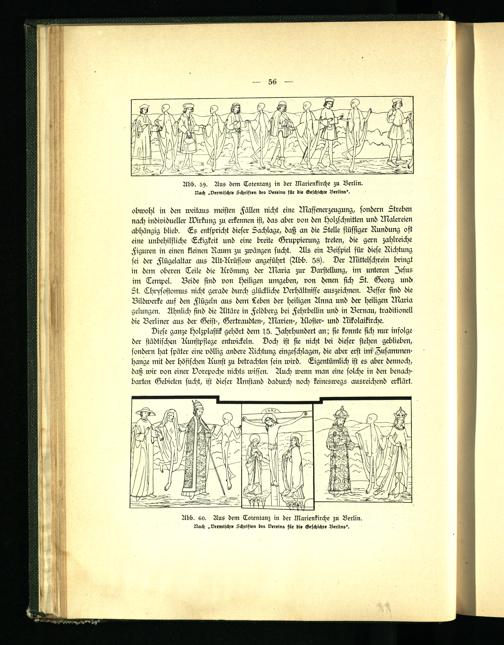 obwohl in den weitaus meisten Fällen nicht eine Massenerzeugung, sondern Streben nach individueller Wirkung zu erkennen ist, das aber von den Holzschnitten und Malereien abhängig blieb. Es entspricht dieser Sachlage, daß an die Stelle flüssiger Rundung oft eine unbehilfliche Eckigkeit und eine breite Gruppierung treten, die gern zahlreiche Figuren in einen kleinen Raum zu zwängen sucht. Als ein Beispiel für diese Richtung sei der Flügelaltar aus Alt-Krüssow angeführt (Abb. 58). Der Mittelschrein bringt in dem oberen Teile die Krönung der Maria zur Darstellung, im unteren Jesus im Tempel. Beide sind von Heiligen umgeben, von denen sich St. Georg und. St. Chrysostomus mcht gerade durch glückliche Verhältnisse auszeichnen. Besser sind die Bildwerke auf den Flügeln aus dem Leben der heiligen Anna und der heiligen Maria gelungen. Ähnlich sind die Altäre in Feldberg bei Fehrbellin und in Bernau, traditionell die Berliner aus der Geist-, Gertraudten-, Marien-, Kloster- und Nikolaikirche.