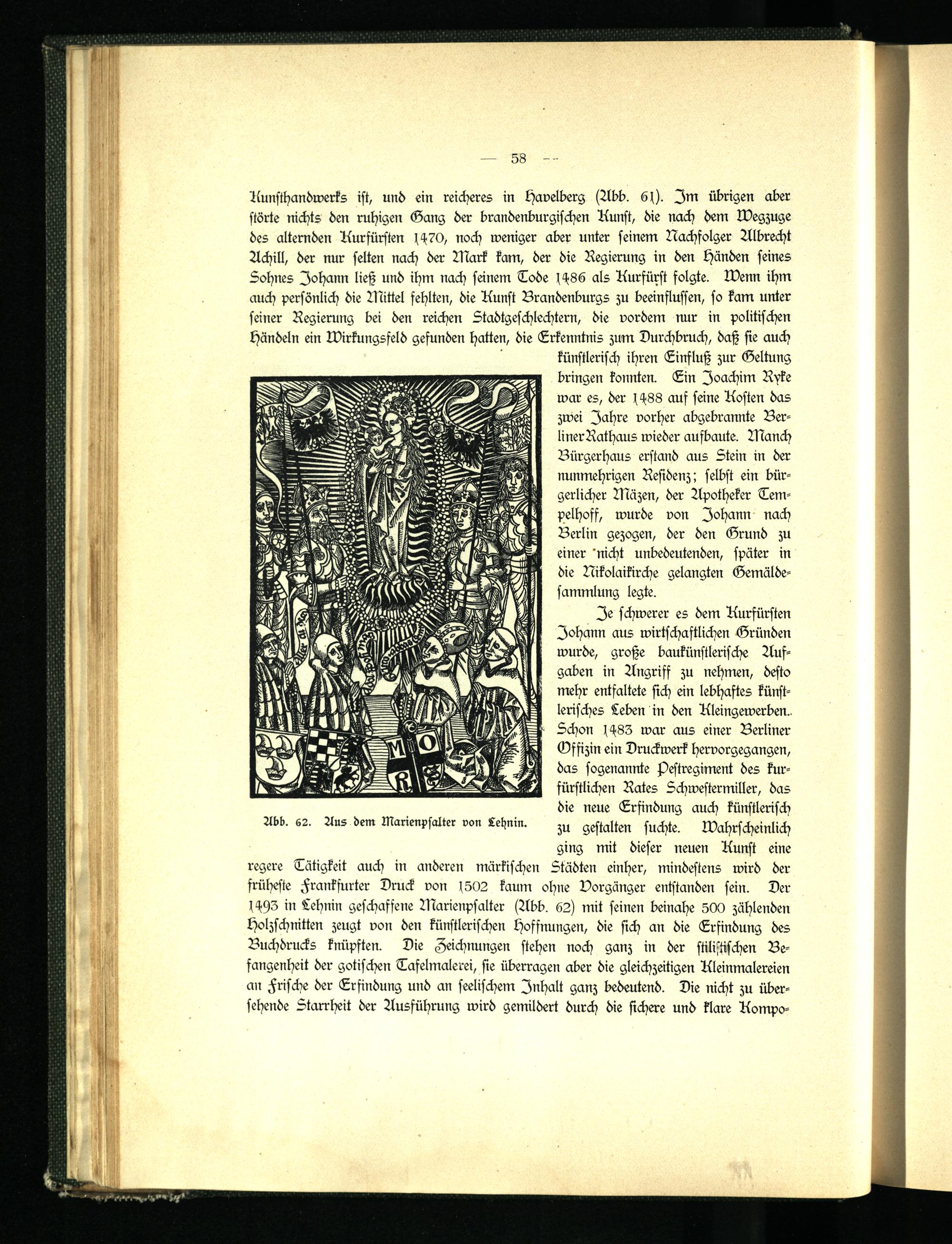 Je schwerer es dem Kurfürsten Johann aus wirtschaftlichen Gründen wurde, große baukünstlerische Ausgaben in Angriff zu nehmen, desto mehr entfaltete sich ein lebhaftes künstlerisches Leben in den Kleingewerben.. Schon 1483 war aus einer Berliner Offizin ein Druckwerk hervorgegangen, das sogenannte Pestregiment des kurfürstlichen Rates Schwestermiller, das die neue Erfindung auch künstlerisch Abb. 6 2 . Aus dem Marienpsalter von Lehnin. gestalten suchte, wahrscheinlich
