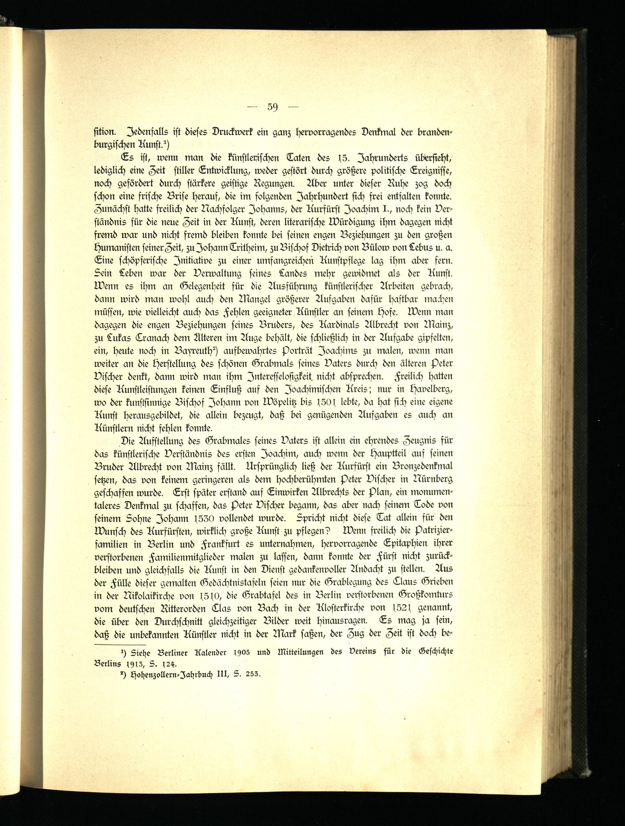Es ist, wenn man die künstlerischen Taten des 15. Jahrunderts übersicht, lediglich eine Zeit stiller Entwicklung, weder gestört durch größere politische Ereignisse, noch gefördert durch stärkere geistige Regungen. Aber unter dieser Ruhe zog doch schon eine frische Brise herauf, die im folgenden Jahrhundert sich frei entfalten konnte. Zunächst hatte freilich der Nachfolger Johanns, der Kurfürst Joachim I., noch kein Verständnis für die neue Zeit in der Kunst, deren literarische Würdigung ihm dagegen nicht fremd war und nicht fremd bleiben konnte bei seinen engen Beziehungen zu den großen Humanisten seinerZeit, zu Johann Tritheim, zu Bischof Dietrich von Bülow von Lebus u. a. Eine schöpferische Initiative zu einer umfangreichen Kunstpflege lag ihm aber fern. Sein Leben war der Verwaltung seines Landes mehr gewidmet als der Kunst. Wenn es ihm an Gelegenheit für die Ausführung künstlerischer Arbeiten gebrach, dann wird man wohl auch den Mangel größerer Aufgaben dafür haftbar machen müssen, wie vielleicht auch das Fehlen geeigneter Künstler an seinem Hofe. Wenn man dagegen die engen Beziehungen seines Bruders, des Kardinals Albrecht von Mainz, zu Lukas Cranach dem Alteren im Auge behält, die schließlich in der Aufgabe gipfelten, ein, heute noch in Bayreuths aufbewahrtes Porträt Joachims zu malen, wenn man weiter an die Herstellung des schönen Grabmals seines Vaters durch den älteren Peter Vischer denkt, dann wird man ihm Interesselosigkeit, nicht absprechen. Freilich hatten diese Kunstleistungen keinen Einfluß auf den Joachimischen Kreis; nur in havelberg, wo der kunstsinnige Bischof Johann von Wöpelitz bis 1501 lebte, da hat sich eine eigene Kunst herausgebildet, die allein bezeugt, daß bei genügenden Aufgaben es auch an Künstlern nicht fehlen konnte.