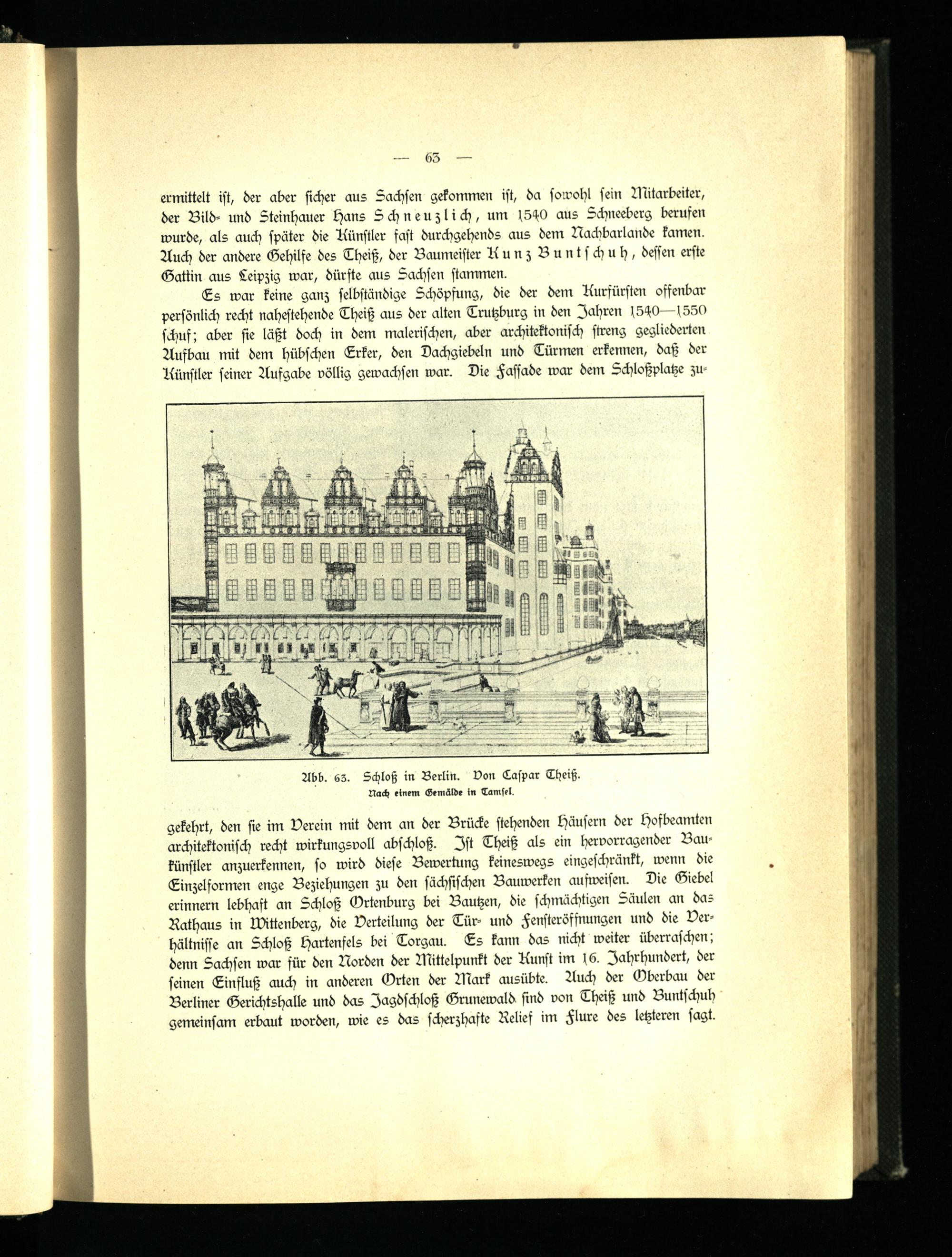 gekehrt, den sie im Verein mit dem an der Brücke stehenden Häusern der Hofbeamten architektonisch recht wirkungsvoll abschloß, Ist Theiß als ein hervorragender Baukünstler anzuerkennen, so wird diese Bewertung keineswegs eingeschränkt, wenn die Einzelformen enge Beziehungen zu den sächsischen Bauwerken ausweisen. Die Giebel erinnern lebhaft an Schloß Ortenburg bei Bautzen, die schmächtigen Säulen an das Rathaus in Wittenberg, die Verteilung der Tür- und Fensteröffnungen und die Verhältnisse an Schloß Hartenfels bei Torgau. Es kann das nicht weiter überraschen; denn Sachsen war für den Norden der Mittelpunkt der Kunst im 16. Jahrhundert, der seinen Einfluß auch in anderen Orten der Mark ausübte. Auch der Oberbau der Berliner Gerichtshalle und das Jagdschloß Grunewald sind von Theiß und Buntschuh gemeinsam erbaut worden, wie es das scherzhafte Relief im Flure des letzteren sagt.