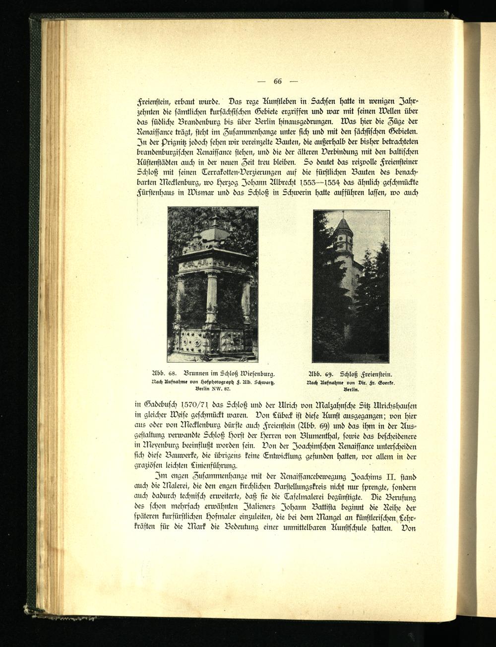 in Gadebusch 1570/71 das Schloß und der Ulrich von Malzahnsche Sitz Ulrichshausen in gleicher Weise geschmückt waren. Von Lübeck ist diese Kunst ausgegangen; von hier aus oder von Mecklenburg dürfte auch Freienstein (Abb. 69) und das ihm in der Ausgestaltung verwandte Schloß Horst der Herren von Blumenthal, sowie das bescheidenere in Meyenburg beeinflußt worden sein. Von der Joachimschen Renaissance unterscheiden sich diese Bauwerke, die übrigens keine Entwicklung gefunden hatten, vor allem in der graziösen leichten Linienführung.