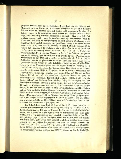 Der Gedankenkreis dieser Kunst ist klein, wie bereits Borrmann hervorhebt; er beschränkt sich im wesentlichen auf die Anlehnung und Auslegung der Stellen des Alten Testamentes, die von der Erlösung des Menschen handeln und die oft als Text beigefügt werden, aber er vermeidet es fast ängstlich, auch die Offenbarungen des Neuen Testamentes, wie es die protestantische Lehre eigentlich voraussetzen sollte, in den Darstellungskreis zu ziehen. Von der Renaissance wurde diese Malerei durch einen zunächst noch verständlichen, später immer mehr allegorisch umkleideten kirchlichen Schematismus bereichert, aus der gotischen Vergangenheit aber durch eine üppige Phantasie dem Verständnis weiter Kreise nahegerückt. Es mischen sich Gläubigkeit und Weltlichkeit, ein oberflächlicher Formalismus mit einer tieferen Gedankenwelt, wie es das Epitaphium des Bürgermeisters Thomas Matthias von 1576 (?) bezeugt, auf dem der symbolische