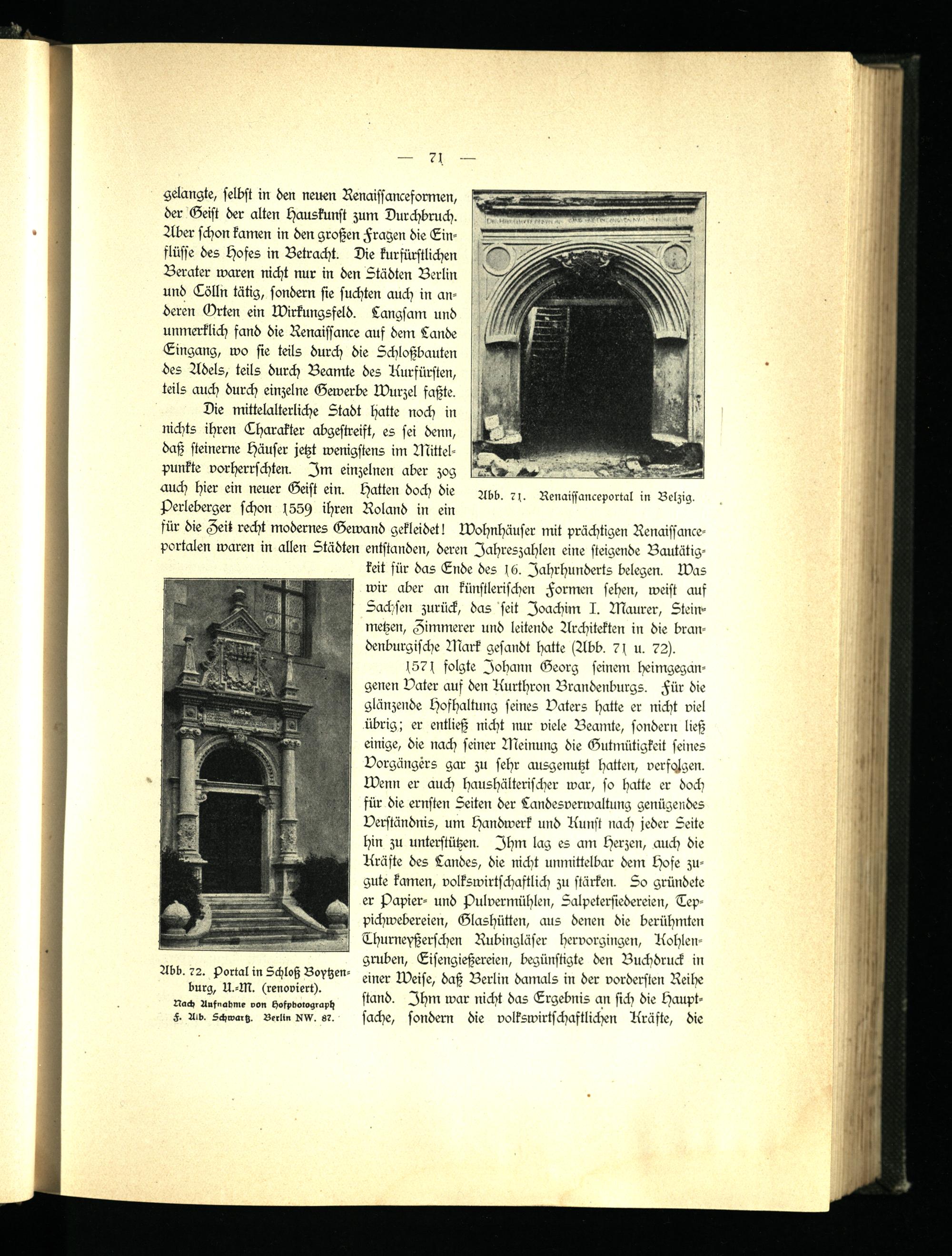 1571 folgte Johann Georg seinem heimgegangenen Vater auf den Kurthron Brandenburgs. Für die glänzende Hofhaltung seines Vaters hatte er nicht viel übrig; er entließ nicht nur viele Beamte, sondern ließ einige, die nach seiner Meinung die Gutmütigkeit seines Vorgängers gar zu sehr ausgenutzt hatten, verfügen. Wenn er auch haushälterischer war, so hatte er doch für die ernsten Seiten der Landesverwaltung genügendes Verständnis, um Handwerk und Kunst nach jeder Seite hin zu unterstützen. Ihm lag es am Herzen, auch die Kräfte des Landes, die nicht unmittelbar dem Hofe zugute kamen, volkswirtschaftlich zu stärken. So gründete er Papier- und Pulvermühlen, Salpetersiedereien, Teppichwebereien, Glashütten, aus denen die berühmten Thurneyßerschen Rubingläser hervorgingen, Kohlengruben, Eisengießereien, begünstigte den Buchdruck in Abb. e 72. Portal in Schloß Boytzen- einer Weise, daß Berlin damals in der vordersten Reih