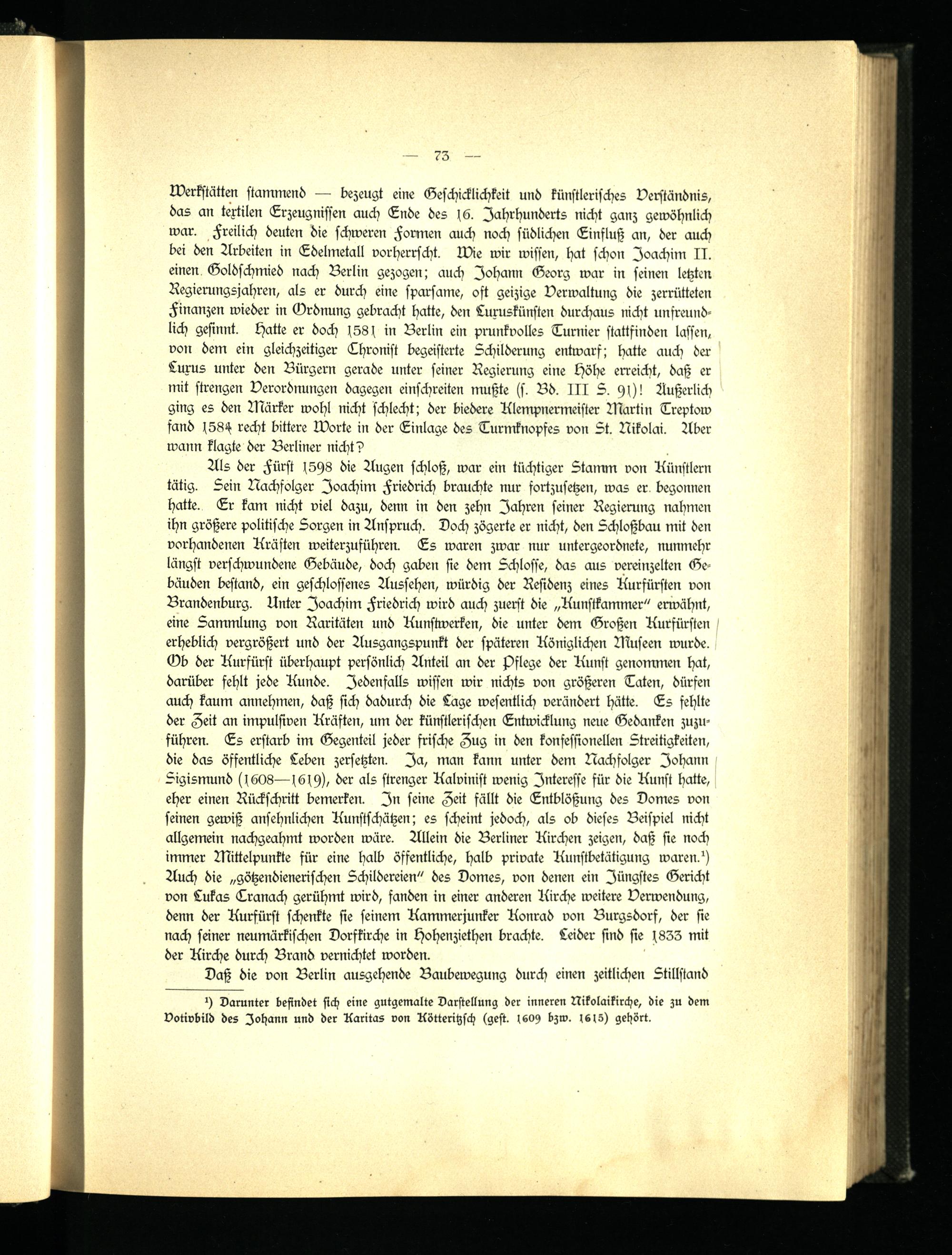 Als der Fürst 1598 die Augen schloß, war ein tüchtiger Stamm von Künstlern tätig. Sein Nachfolger Joachim Friedrich brauchte nur sortzusetzen, was er. begonnen hatte. Er kam nicht viel dazu, denn in den zehn Jahren seiner Regierung nahmen ihn größere politische Sorgen in Anspruch. Doch zögerte er nicht, den Schloßbau mit den vorhandenen Kräften weiterzuführen. Es waren zwar nur untergeordnete, nunmehr längst verschwundene Gebäude, doch gaben sie dem Schlosse, das aus vereinzelten Gebäuden bestand, ein geschlossenes Aussehen, würdig der Residenz eines Kurfürsten von Brandenburg. Unter Joachim Friedrich wird auch zuerst die „Kunstkammer" erwähnt, eine Sammlung von Raritäten und Kunstwerken, die unter dem Großen Kurfürsten erheblich vergrößert und der Ausgangspunkt der späteren Königlichen Museen wurde. Ob der Kurfürst überhaupt persönlich Anteil an der pflege der Kunst genommen hat, darüber fehlt jede Kunde. Jedenfalls wissen wir nichts von größeren Taten, dürfen auch kaum annehmen, daß sich dadurch die Lage wesentlich verändert hätte. Es fehlte der Zeit an impulsiven Kräften, um der künstlerischen Entwicklung neue Gedanken zuzuführen. Es erstarb im Gegenteil jeder frische Zug in den konfessionellen Streitigkeiten, die das öffentliche Leben zersetzten. Ja, man kann unter dem Nachfolger Johann Sigismund 1608—1619), der als strenger Kalvinist wenig Interesse für die Kunst hatte, eher einen Rückschritt bemerken. In seine Zeit fällt die Entblößung des Domes von seinen gewiß ansehnlichen Kunstschätzen; es scheint jedoch, als ob dieses Beispiel nicht allgemein nachgeahmt worden wäre. Allein die Berliner Kirchen zeigen, daß sie noch immer Mittelpunkte für eine halb öffentliche, halb private Kunstbetätigung waren.1) Auch die „götzendienerischen Schilderten" des Domes, von denen ein Jüngstes Gericht von Lukas Cranach gerühmt wird, fanden in einer anderen Kirche weitere Verwendung, denn der Kurfürst schenkte sie seinem Kammerjunker Konrad von Burgsdorf, der sie nach seiner neumärkischen Dorfkirche in Hohenziethen brachte. Leider sind sie 1833 mit der Kirche durch Brand vernichtet worden.