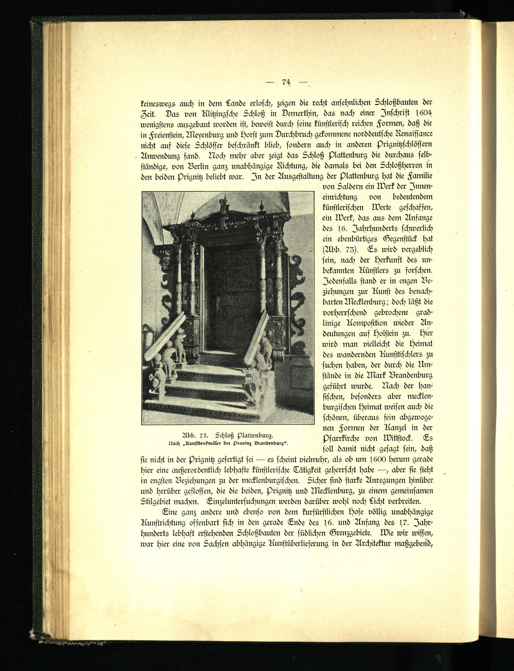 von Saldern ein Werk der Inneneinrichtung von bedeutendem künstlerischen Werte geschaffen, ein Werk, das aus dem Anfänge des 16. Jahrhunderts schwerlich ein ebenbürtiges Gegenstück hat (Abb. 73). Es wird vergeblich sein, nach der Herkunft des unbekannten Künstlers zu forschen. Jedenfalls stand er in engen Beziehungen zur Kunst des benachbarten Mecklenburg; doch läßt die vorherrschend gebrochene gradlinige Komposition wieder Andeutungen auf Holstein zu. hier wird man vielleicht die Heimat des wandernden Kunsttischlers zu suchen haben, der durch die Umstände in die Mark Brandenburg geführt wurde. Nach der hansischen, besonders aber mecklenburgischen Heimat weisen auch die schönen, überaus fein abgewogenen Formen der Kanzel in der Pfarrkirche von Wittstock. Es soll damit nicht gesagt sein, daß sie nicht in der prignitz gefertigt sei — es scheint vielmehr, als ob um 1600 herum gerade hier eine außerordentlich lebhafte künstlerische Tätigkeit geherrscht habe —, aber sie steht in engsten Beziehungen zu der mecklenburgischen. Sicher sind starke Anregungen hinüber und herüber geflossen, die die beiden, prignitz und Mecklenburg, zu einem gemeinsamen Stilgebiet machen. Linzeluntersuchungen werden darüber wohl noch Licht verbreiten.