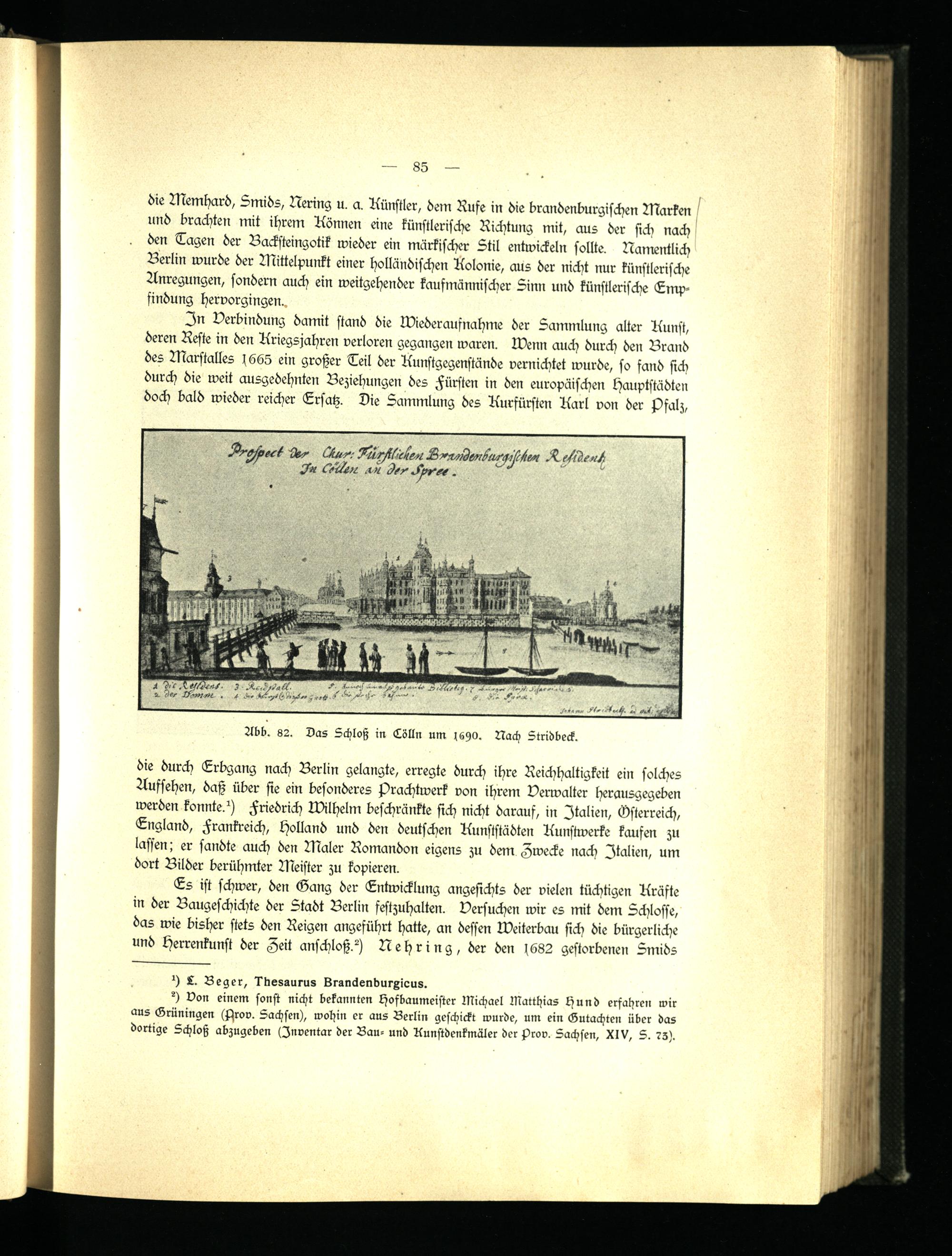 Es ist schwer, den Gang der Entwicklung angesichts der vielen tüchtigen Kräfte in der Baugeschichte der Stadt Berlin festzuhalten. Versuchen wir es mit dem Schlosse, das wie bisher stets den Reigen angeführt hatte, an dessen Weiterbau sich die bürgerliche und Herrenkunst der Zeit anschloß.2) Neh ring, der den 1682 gestorbenen Smids