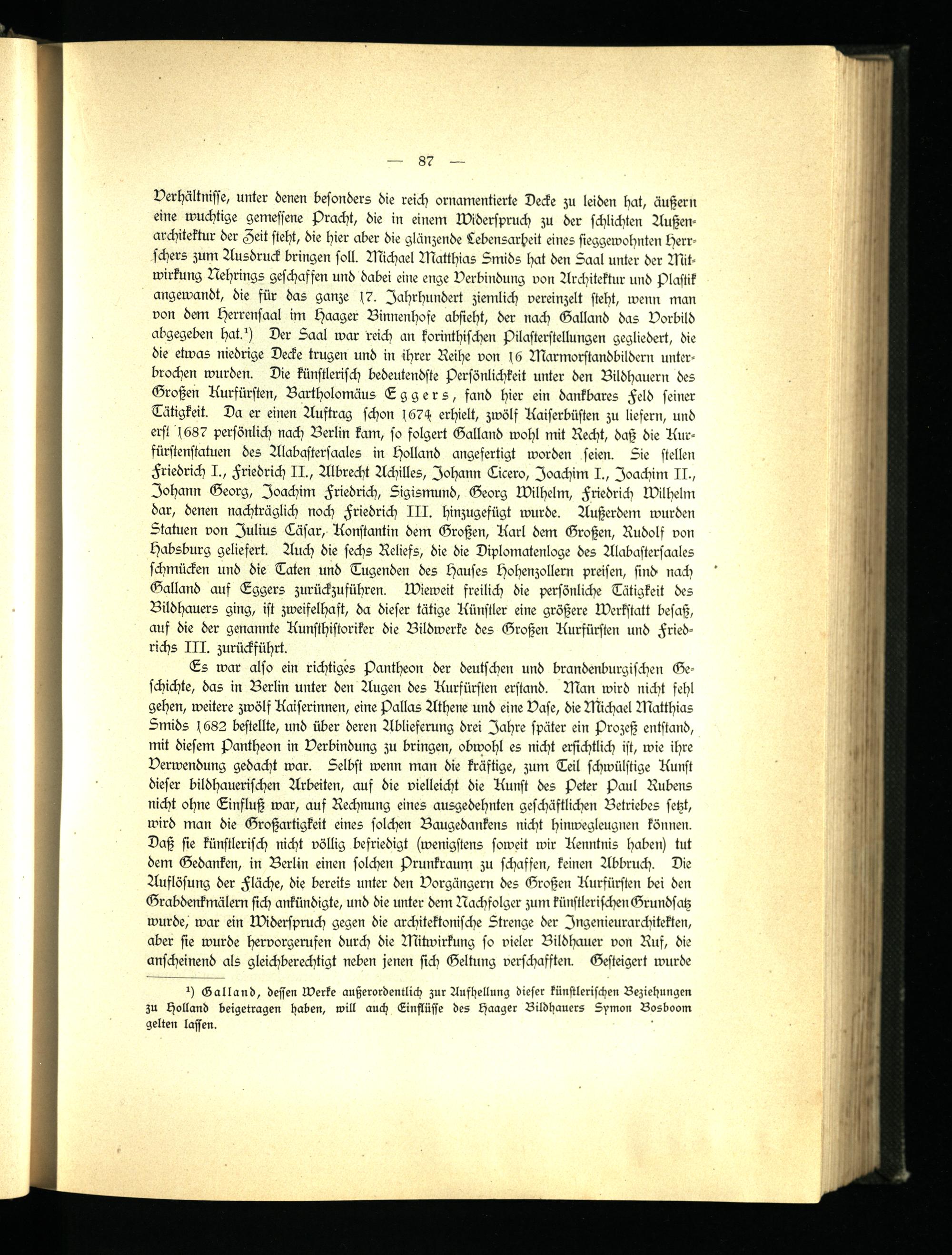 Verhältnisse, unter denen besonders die reich ornamentierte Decke zu leiden hat, äußern eine wuchtige gemessene Pracht, die in einem Widerspruch zu der schlichten Außenarchitektur der Zeit steht, die hier aber die glänzende Lebensarbeit eines sieggewohnten Herrschers zum Ausdruck bringen soll. Michael Matthias Smids hat den Saal unter der Mitwirkung Nehrings geschaffen und dabei eine enge Verbindung von Architektur und Plastik angewandt, die für das ganze 17. Jahrhundert ziemlich vereinzelt steht, wenn man von dem Herrensaal im Haager Binnenhofe absieht, der nach Galland das Vorbild abgegeben hat.1) Der Saal war reich an korinthischen Pilasterstellungen gegliedert, die die etwas niedrige Decke trugen und in ihrer Reihe von 16 Marmorstandbildern unterbrochen wurden. Die künstlerisch bedeutendste Persönlichkeit unter den Bildhauern des Großen Kurfürsten, Bartholomäus Eggers, fand hier ein dankbares Feld seiner Tätigkeit. Da er einen Auftrag schon 1674 erhielt, zwölf Kaiserbüsten zu liefern, und erst 1687 persönlich nach Berlin kam, so folgert Galland wohl mit Recht, daß die Kurfürstenstatuen des Alabastersaales in Holland angefertigt worden seien. Sie stellen Friedrich I., Friedrich II., Albrecht Achilles, Johann Cicero, Joachim I., Joachim II., Johann Georg, Joachim Friedrich, Sigismund, Georg Wilhelm, Friedrich Wilhelm dar, denen nachträglich noch Friedrich III. hinzugefügt wurde. Außerdem wurden Statuen von Julius Cäsar, Konstantin dem Großen, Karl dem Großen, Rudolf von Habsburg geliefert. Auch die sechs Reliefs, die die Diplomatenloge des Alabastersaales schmücken und die Taten und Tugenden des Hauses Hohenzollern preisen, sind nach Galland auf Eggers zurückzusühren. Wieweit freilich die persönliche Tätigkeit des Bildhauers ging, ist zweifelhaft, da dieser tätige Künstler eine größere Werkstatt besaß, auf die der genannte Kunsthistoriker die Bildwerke des Großen Kurfürsten und Friedrichs III. zurückführt.