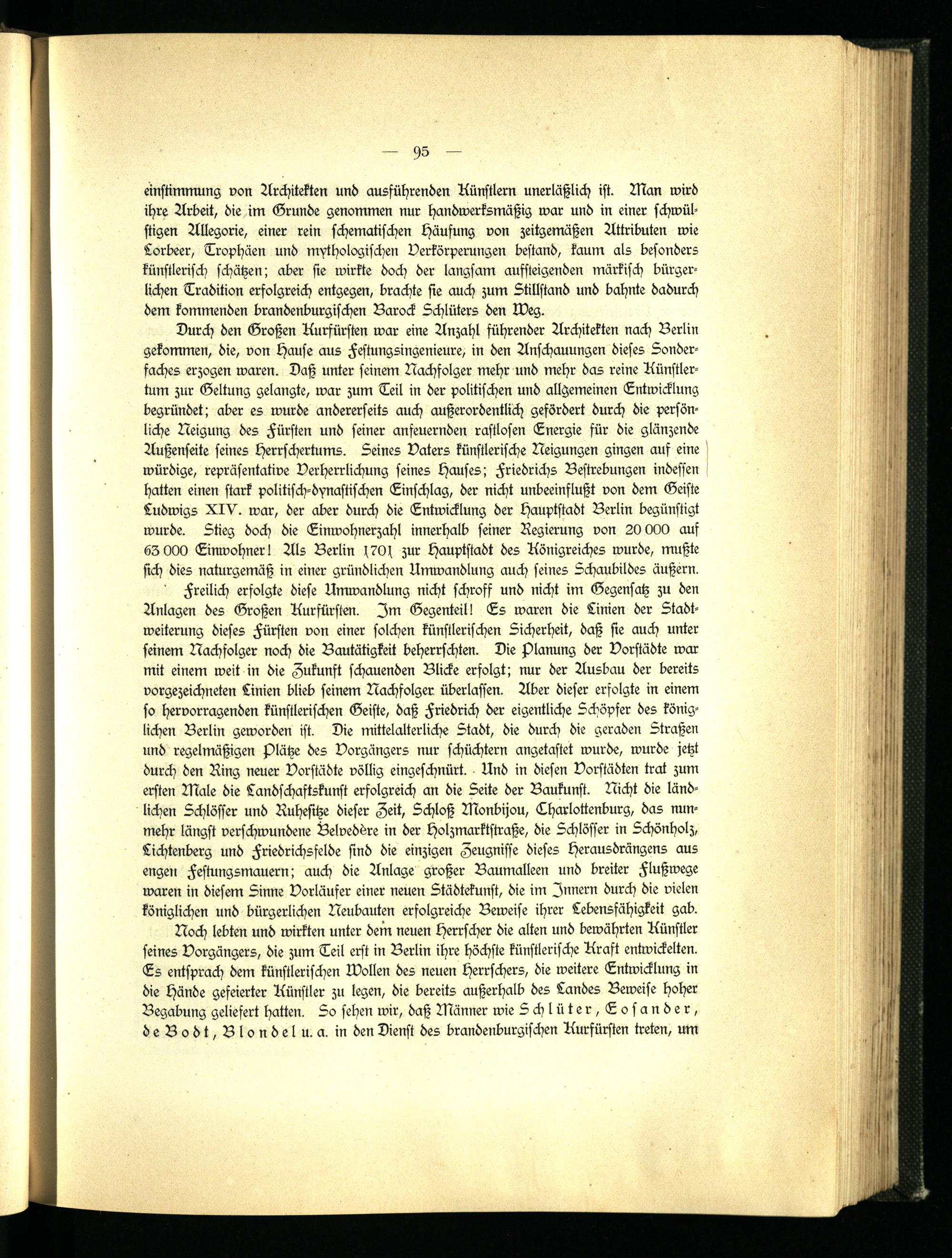 Noch lebten und wirkten unter dem neuen Herrscher die alten und bewährten Künstler seines Vorgängers, die zum Teil erst in Berlin ihre höchste künstlerische Kraft entwickelten. Es entsprach dem künstlerischen Wollen des neuen Herrschers, die weitere Entwicklung in die Hände gefeierter Künstler zu legen, die bereits außerhalb des Landes Beweise hoher Begabung geliefert hatten. So sehen wir, daß Männer wie Schlüter, Eosander, de Bodt, Blondel u. a. in den Dienst des brandenburgischen Kurfürsten treten, um