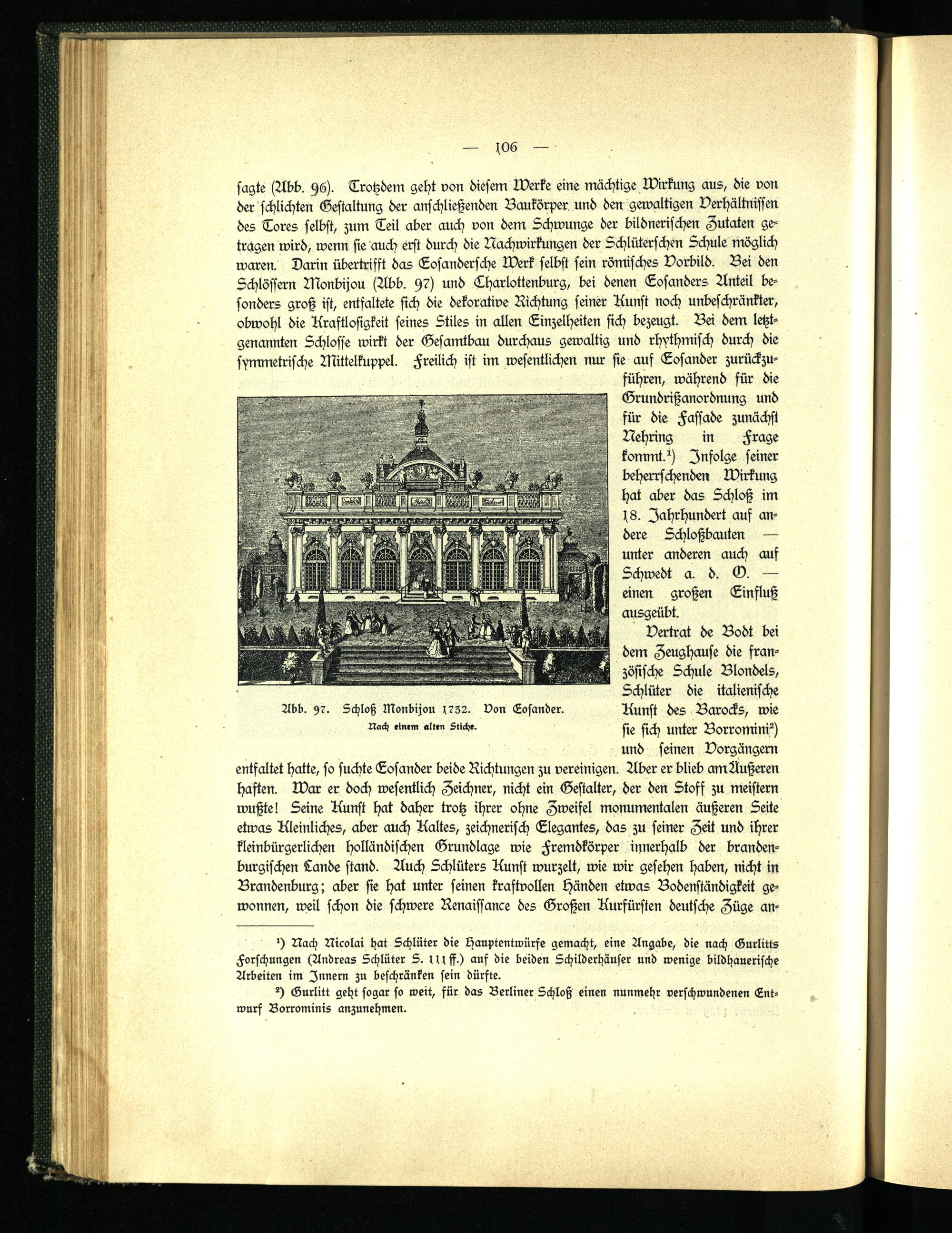 sagte (Abb. 96). Trotzdem geht von diesem Werke eine mächtige Wirkung aus, die von der schlichten Gestaltung der anschließenden Baukörper und den gewaltigen Verhältnissen des Tores selbst, zum Teil aber auch von dem Schwungs der bildnerischen Zutaten getragen wird, wenn sie auch erst durch die Nachwirkungen der Schlüterschen Schule möglich waren. Darin übertrifft das Eosandersche Werk selbst sein römisches Vorbild. Bei den Schlössern Monbijou (Abb. 97) und Charlottenburg, bei denen Eosanders Anteil besonders groß ist, entfaltete sich die dekorative Richtung seiner Kunst noch unbeschränkter, obwohl die Kraftlosigkeit seines Stiles in allen Einzelheiten sich bezeugt. Bei dem letztgenannten Schlosse wirkt der Gesamtbau durchaus gewaltig und rhythmisch durch die symmetrische Mittelkuppel. Freilich ist im wesentlichen nur sie auf Eosander zurückzu-