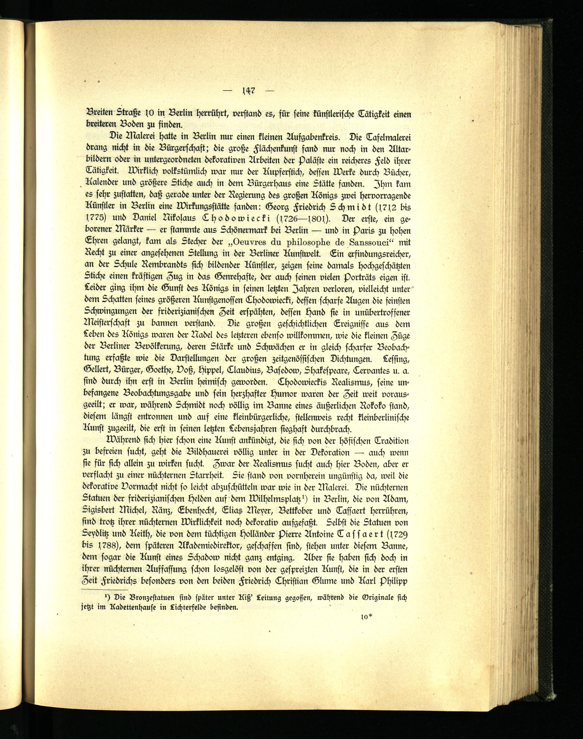Die Malerei hatte in Berlin nur einen kleinen Aufgabenkreis. Die Tafelmalerei drang nicht in die Bürgerschaft; die große Flächenkunst fand nur noch in den Altarbildern oder in untergeordneten dekorativen Arbeiten der Paläste ein reicheres Feld ihrer Tätigkeit. Wirklich volkstümlich war nur der Kupferstich, dessen Werke durch Bücher, Kalender und größere Stiche auch in dem Bürgerhaus eine Stätte fanden. Ihm kam es sehr zustatten, daß gerade unter der Regierung des großen Königs zwei hervorragende Künstler in Berlin eine Wirkungsstätte fanden: Georg Friedrich Schmidt (1712 bis 1775) und Daniel Nikolaus Chodowiecki (1726—1801). Der erste, ein geborener Märker — er stammte aus Schönermark bei Berlin — und in Paris zu hohen Ehren gelangt, kam als Stecher der „Oeuvres du philosophe de Sanssouci" mit Recht zu einer angesehenen Stellung in der Berliner Kunstwelt. Ein erfindungsreicher, an der Schule Rembrandts sich bildender Künstler, zeigen seine damals hochgeschätzten Stiche einen kräftigen Zug in das Genrehafte, der auch seinen vielen Porträts eigen ist. Leider ging ihm die Gunst des Königs in seinen letzten Jahren verloren, vielleicht unter dem Schatten seines größeren Kunstgenossen Chodowiecki, dessen scharfe Augen die feinsten Schwingungen der friderizianischen Zeit erspähten, dessen Hand sie in unübertroffener Meisterschaft zu bannen verstand. Die großen geschichtlichen Ereignisse aus dem Leben des Königs waren der Nadel des letzteren ebenso willkommen, wie die kleinen Züge der Berliner Bevölkerung, deren Stärke und Schwächen er in gleich scharfer Beobachtung erfaßte wie die Darstellungen der großen zeitgenössischen Dichtungen. Lessing, Gellert, Bürger, Goethe, Voß, Hippel, Claudius, Basedow, Shakespeare, Cervantes u. a. sind durch ihn erst in Berlin heimisch geworden. Chodowieckis Realismus, seine unbefangene Beobachtungsgabe und sein herzhafter Humor waren der Zeit weit vorausgeeilt; er war, während Schmidt noch völlig im Banne eines äußerlichen Rokoko stand, diesem längst entronnen und auf eine kleinbürgerliche, stellenweis recht kleinberlinische Kunst zugeeilt, die erst in seinen letzten Lebensjahren sieghaft durchbrach.