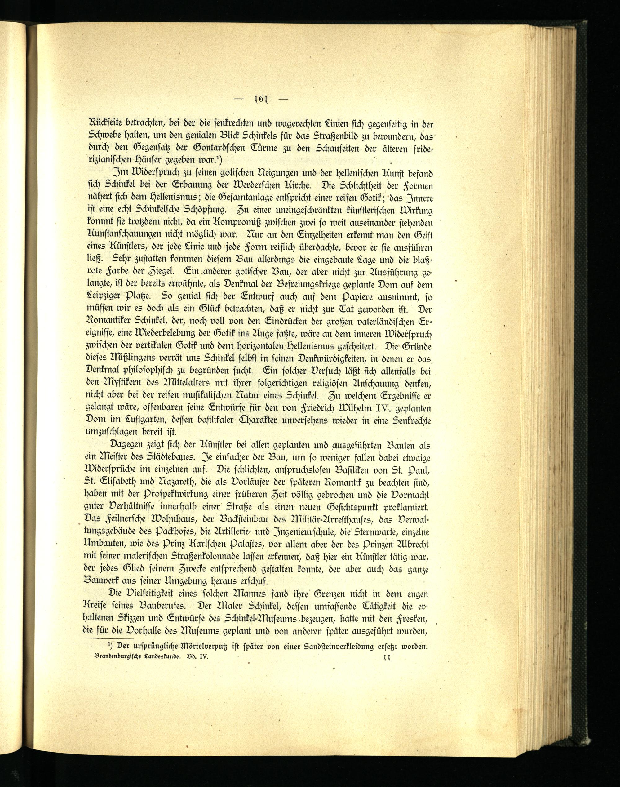Im Widerspruch zu seinen gotischen Neigungen und der hellenischen Kunst befand sich Schinkel bei der Erbauung der Werderschen Kirche. Die Schlichtheit der Formen nähert sich dem Hellenismus; die Gesamtanlage entspricht einer reifen Gotik; das Innere ist eine echt Schinkelsche Schöpfung. Au einer uneingeschränkten künstlerischen Wirkung kommt sie trotzdem nicht, da ein Kompromiß zwischen zwei so weit auseinander stehenden Kunstanschauungen nicht möglich war. Nur an den Einzelheiten erkennt man den Geist eines Künstlers, der jede Linie und jede Form reiflich überdachte, bevor er sie ausführen ließ. Sehr zustatten kommen diesem Bau allerdings die eingebaute Lage und die blaß- rote Farbe der Ziegel. Ein.anderer gotischer Bau, der aber nicht zur Ausführung gelangte, ist der bereits erwähnte, als Denkmal der Befreiungskriege geplante Dom aus dem Leipziger Platze. So genial sich der Entwurf auch auf dem Papiere ausnimmt, so müssen wir es doch als ein Glück betrachten, daß er nicht zur Tat geworden ist. Der Romantiker Schinkel, der, noch voll von den Eindrücken der großen vaterländischen Ereignisse, eine Wiederbelebung der Gotik ins Auge faßte, wäre an dem inneren Widerspruch zwischen der vertikalen Gotik und dem horizontalen Hellenismus gescheitert. Die Gründe dieses Mißlingens verrät uns Schinkel selbst in seinen Denkwürdigkeiten, in denen er das. Denkmal philosophisch zu begründen sucht. Ein solcher Versuch läßt sich allenfalls bei den Mystikern des Mittelalters mit ihrer folgerichtigen religiösen Anschauung denken, nicht aber bei der reifen musikalischen Natur eines Schinkel. Au welchem Ergebnisse er gelangt wäre, offenbaren seine Entwürfe für den von Friedrich Wilhelm IV. geplanten Dom im Lustgarten, dessen basilikaler Tharakter unversehens wieder in eine Senkrechte umzuschlagen bereit ist.