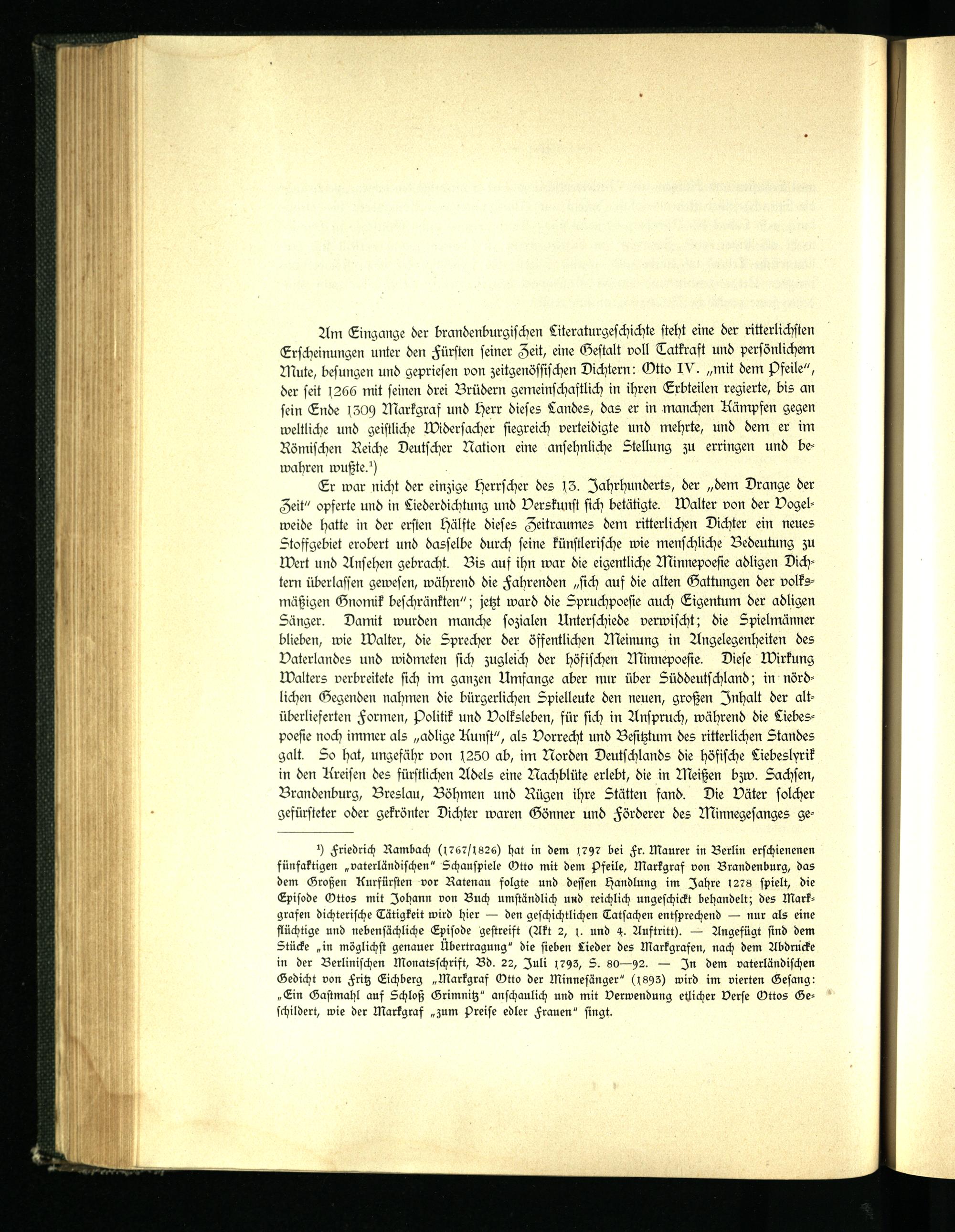1) Friedrich Rambach (1767/1826) hat in dem 1797 bei Fr. Maurer in Berlin erschienenen fünfaktigen „vaterländischen" Schauspiele Otto mit dem Pfeile, Markgraf von Brandenburg, das dem Großen Kurfürsten vor Ratenau folgte und dessen Handlung im Jahre 1278 spielt, die Episode =ttos mit Johann von Buch umständlich und reichlich ungeschickt behandelt; des Markgrafen dichterische Tätigkeit wird hier — den geschichtlichen Tatsachen entsprechend — nur als eine flüchtige und nebensächliche Episode gestreift (Akt 2, 1. und 4. Auftritt). — Angefügt sind dem Stücke „in möglichst genauer Übertragung" die sieben Lieder des Markgrafen, nach dem Abdrücke in der Berlinischen Monatsschrift, Bd. 22, Juli Z 793 , S. 80—92. — In dem vaterländischen Gedicht von Fritz Eichberg „Markgraf Otto der Minnesänger" (1893) wird im vierten Gesang: „Ein Gastmahl auf Schloß Grimnitz" anschaulich und mit Verwendung etlicher Verse Ottos Geschildert, wie der Markgraf „zum Preise edler Frauen" singt.