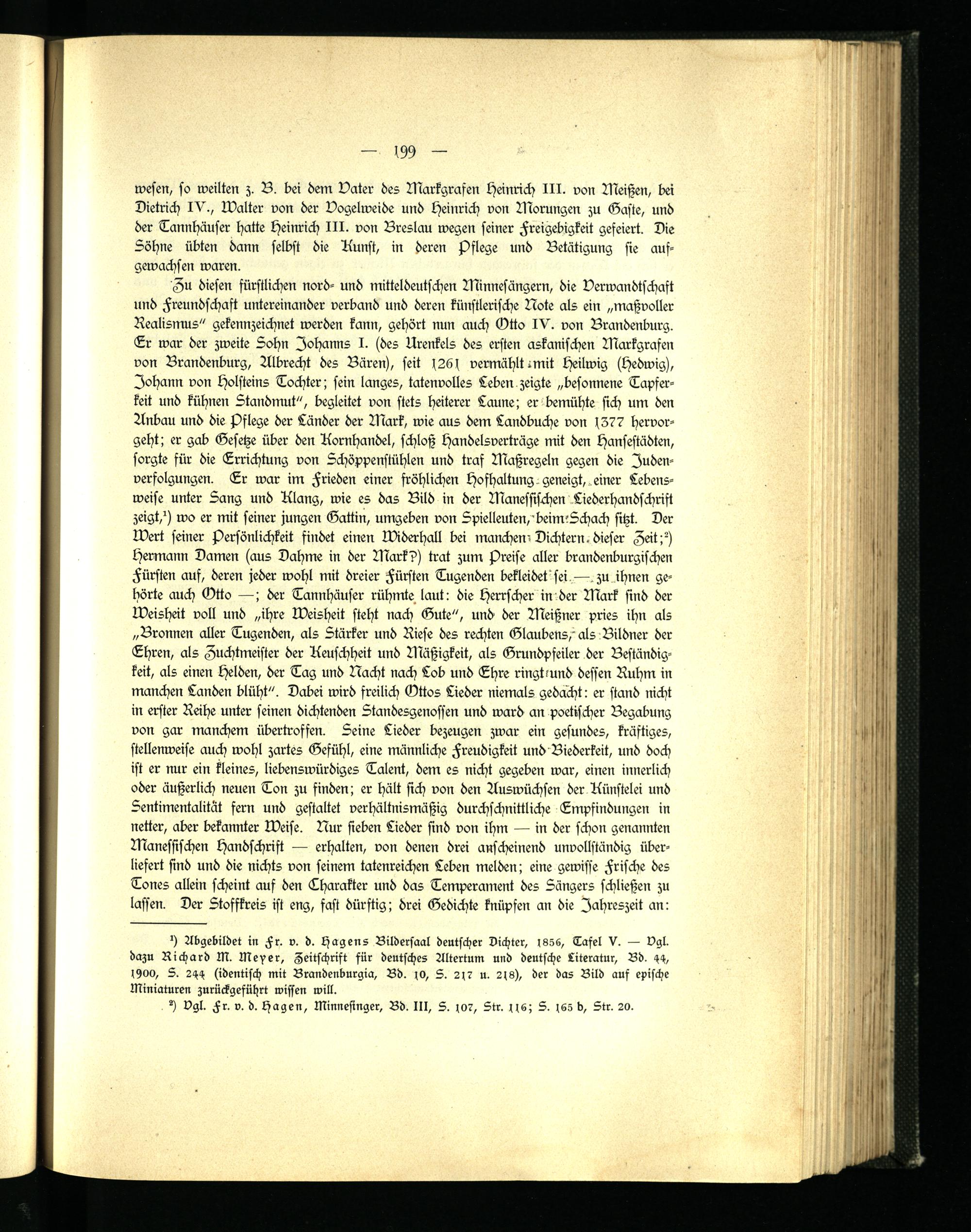 1) Abgebildet in Fr. v. d. Hagens Bildersaal deutscher Dichter, 1856, Tafel V. — vgl. dazu Richard M. Meyer, Zeitschrift für deutsches Altertum und deutsche Literatur, Bd. 44, 1900, S. 244 (identisch mit Brandenburgia, Bd. 40, S. 247 u. 248), der das Bild auf epische Miniaturen zurückgeführt wissen will.