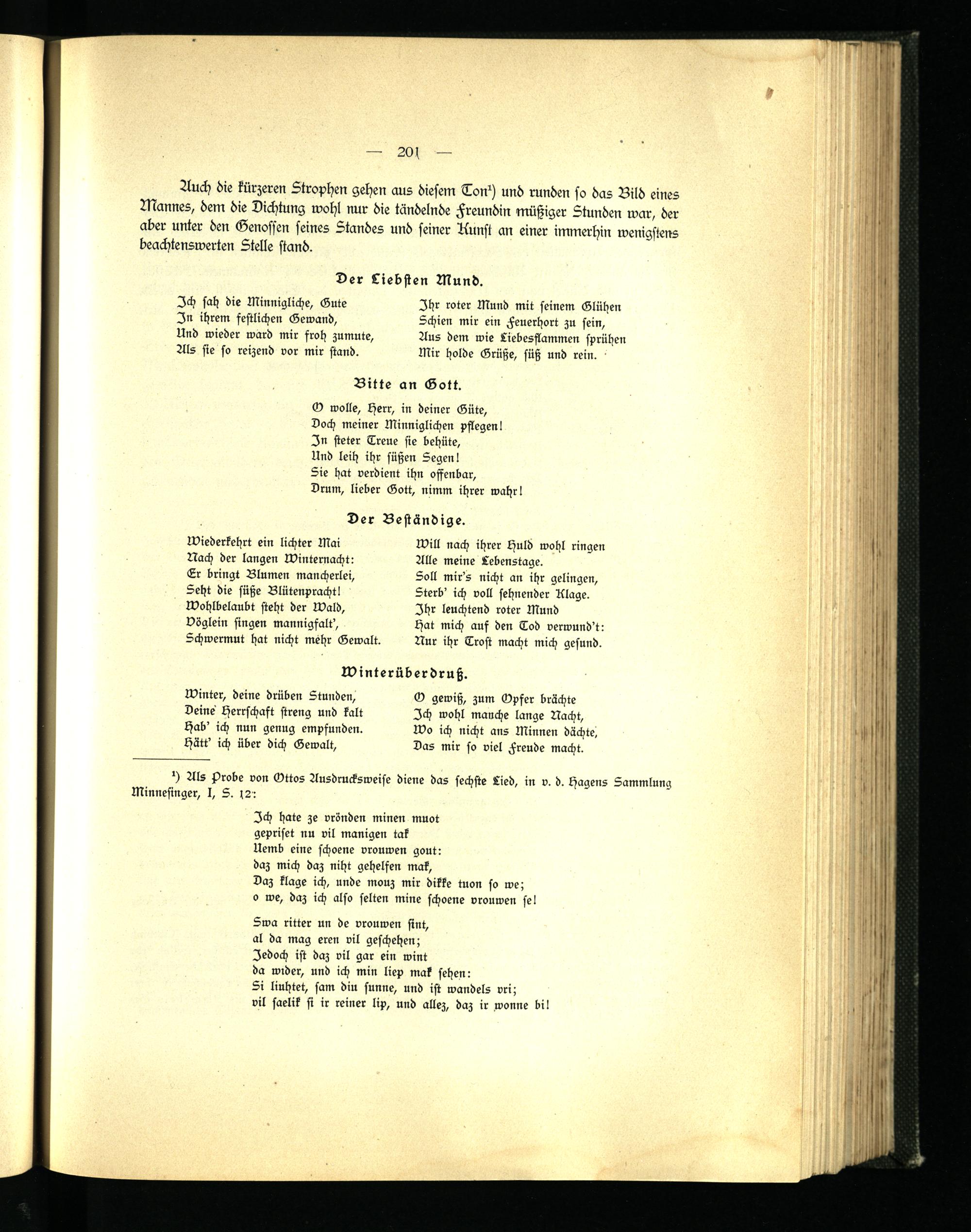 1) Als Probe von Ottos Ausdrucksweise diene das sechste Lied, in v. d. Hägens Sammlung Minnesinger, I, S. 12 :