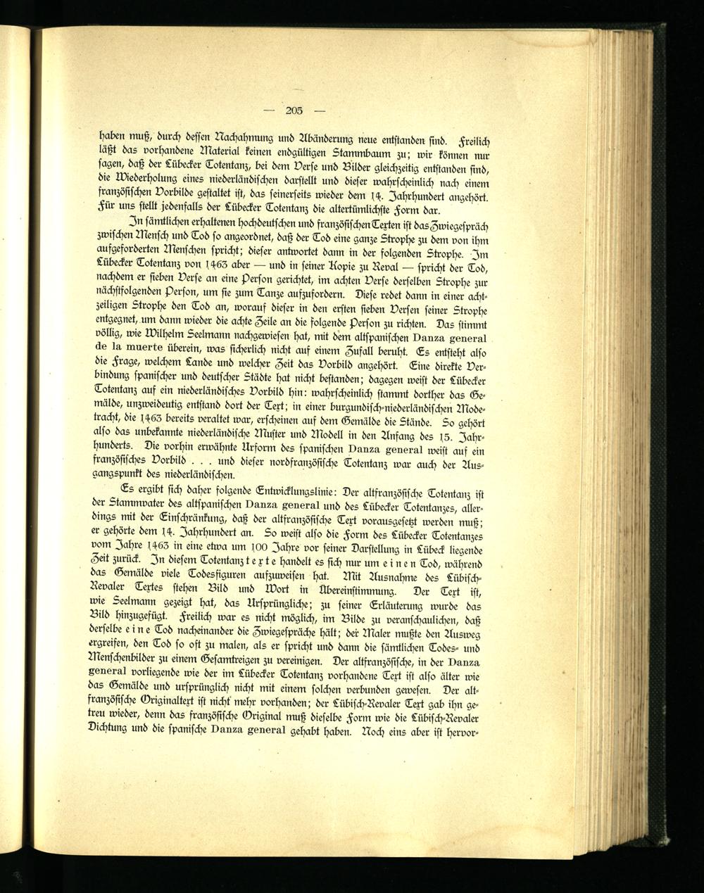 In sämtlichen erhaltenen hochdeutschen und französischenTexten ist dasZwiegespräch zwischen Mensch und Tod so angeordnet, daß der Tod eine ganze Strophe zu dem von ihm aufgeforderten Menschen spricht; dieser antwortet dann in der folgenden Strophe. Im Lübecker Totentanz von 1463 aber — und in seiner Kopie zu Reval — spricht der Tod, nachdem er sieben Verse an eine Person gerichtet, im achten Verse derselben Strophe zur nächstfolgenden Person, um sie zum Tanze aufzufordern. Diese redet dann in einer achtzeiligen Strophe den Tod an, worauf dieser in den ersten sieben Versen seiner Strophe entgegnet, um dann wieder die achte Zeile an die folgende Person zu richten. Das stimmt völlig, wie Wilhelm Seelmann nachgewiesen hat, mit dem altspanischen Danza general de l a muerte überein, was sicherlich nicht auf einem Zufall beruht. Es entsteht also die Frage, welchem Lande und welcher Zeit das Vorbild angehört. Tine direkte Verbindung spanischer und deutscher Städte hat nicht bestanden; dagegen weist der Lübecker Totentanz auf ein niederländisches Vorbild hin: wahrscheinlich stammt dorther das Gemälde, unzweideutig entstand dort der Text; in einer burgundisch-niederländischen Modetracht, die 1463 bereits veraltet war, erscheinen auf dem Gemälde die Stände. So gehört also das unbekannte niederländische Muster und Modell in den Anfang des 15. Jahrhunderts. Die vorhin erwähnte Urform des spanischen Danza general weist auf ein französisches Vorbild . . . und dieser nordfranzösische Totentanz war auch der Ausgangspunkt des niederländischen.