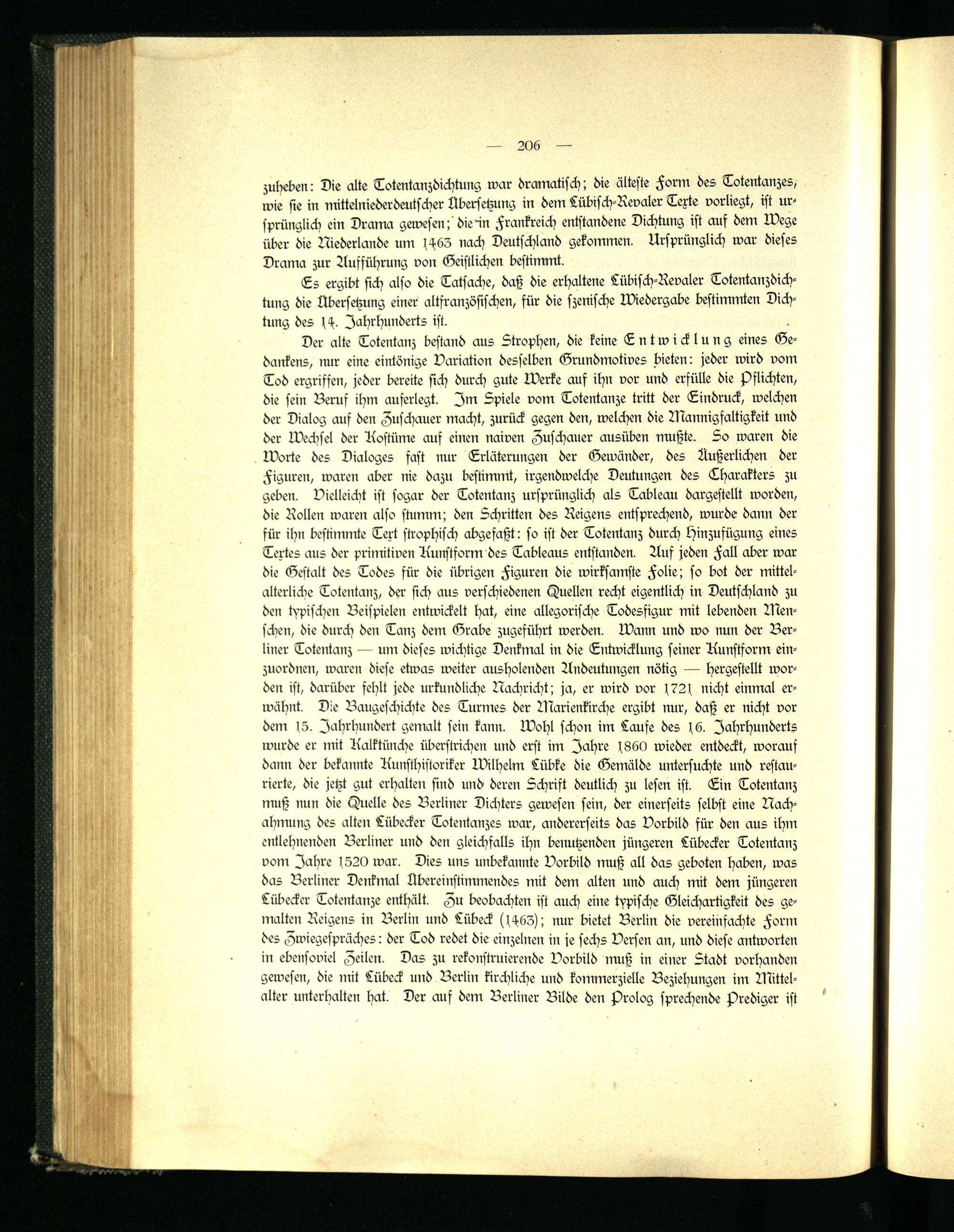 Der alte Totentanz bestand aus Strophen, die keine Entwicklung eines Gedankens, nur eine eintönige Variation desselben Grundmotives bieten: jeder wird vom Tod ergriffen, jeder bereite sich durch gute Werke auf ihn vor und erfülle die Pflichten, die sein Beruf ihm auferlegt. Im Spiele vom Totentänze tritt der Eindruck, welchen der Dialog auf den Zuschauer macht, zurück gegen den, welchen die Mannigfaltigkeit und der Wechsel der Kostüme auf einen naiven Zuschauer ausüben mußte. So waren die Worte des Dialoges fast nur Erläterungen der Gewänder, des Äußerlichen der Figuren, waren aber nie dazu bestimmt, irgendwelche Deutungen des Tharakters zu geben. Vielleicht ist sogar der Totentanz ursprünglich als Tableau dargestellt worden, die Rollen waren also stumm; den Schritten des Reigens entsprechend, wurde dann der für ihn bestimmte Text strophisch abgefaßt: so ist der Totentanz durch lchnzufügung eines Textes aus der primitiven Kunstform des Tableaus entstanden. Auf jeden Fall aber war die Gestalt des Todes für die übrigen Figuren die wirksamste Folie; so bot der mittelalterliche Totentanz, der sich aus verschiedenen Quellen recht eigentlich in Deutschland zu de» typischen Beispielen entwickelt hat, eine allegorische Todesfigur mit lebenden Menschen, die durch den Tanz dem Grabe zugeführt werden, wann und wo nun der Berliner Totentanz — um dieses wichtige Denkmal in die Entwicklung seiner Aunstform einzuordnen, waren diese etwas weiter ausholenden Andeutungen nötig — hergestellt worden ist, darüber fehlt jede urkundliche Nachricht; ja, er wird vor 1721 nicht einmal erwähnt. Die Baugeschichte des Turmes der Marienkirche ergibt nur, daß er nicht vor dem 15. Jahrhundert gemalt sein kann. Wohl schon im Laufe des 16. Jahrhunderts wurde er mit Kalktünche überstrichen und erst im Jahre 1860 wieder entdeckt, worauf dann der bekannte Kunsthistoriker Wilhelm Lübke die Gemälde untersuchte und restaurierte, die jetzt gut erhalten sind und deren Schrift deutlich zu lesen ist. Ein Totentanz muß nun die Quelle des Berliner Dichters gewesen sein, der einerseits selbst eine Nachahmung des alten Lübecker Totentanzes war, andererseits das Vorbild für den aus ihm entlehnenden Berliner und den gleichfalls ihn benutzenden jüngeren Lübecker Totentanz vom Jahre 1520 war. Dies uns unbekannte Vorbild muß all das geboten haben, was das Berliner Denkmal Übereinstimmendes mit dem alten und auch mit dem jüngeren Lübecker Totentänze enthält. Zu beobachten ist auch eine typische Gleichartigkeit des gemalten Reigens in Berlin und Lübeck (1463); nur bietet Berlin die vereinfachte Form des Zwiegespräches: der Tod redet die einzelnen in je sechs Versen an, und diese antworten in ebensoviel Zeilen. Das zu rekonstruierende Vorbild muß in einer Stadt vorhanden gewesen, die mit Lübeck und Berlin kirchliche und kommerzielle Beziehungen im Mittel- alter unterhalten hat. Der auf dem Berliner Bilde den Prolog sprechende Prediger ist '
