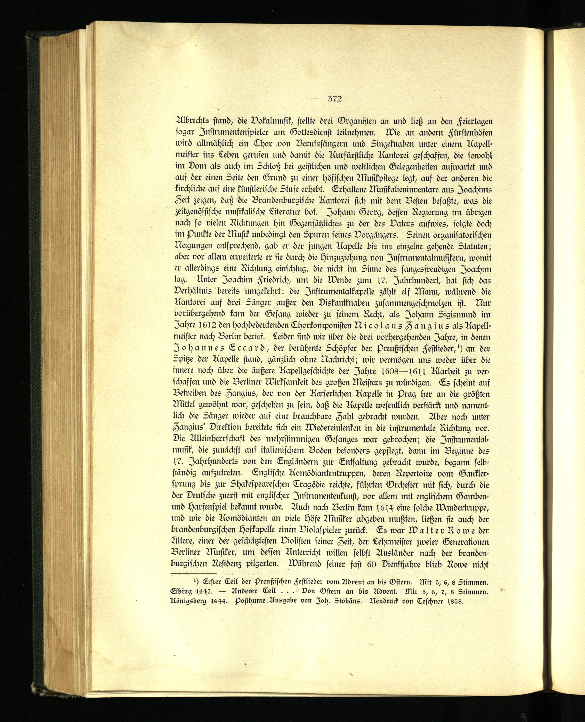 Albrechts stand, die Vokalmusik, stellte drei Organisten an und ließ an den Feiertagen sogar Instrumentenspieler am Gottesdienst teilnehmen. Wie an andern Fürstenhöfen wird allmählich ein Chor.von Berufssängern und Singeknaben unter einem Kapellmeister ins Leben gerufen und damit die Kurfürstliche Kantorei geschaffen, die sowohl im Dom als auch im Schloß bei geistlichen und weltlichen Gelegenheiten aufwartet und auf der einen Seite den Grund zu einer höfischen Musikpflege legt, auf der anderen die kirchliche auf eine künstlerische Stufe erhebt. Erhaltene Musikalieninventare aus Joachims Zeit zeigen, daß die Brandenburgische Kantorei sich mit dem Besten befaßte, was die zeitgenössische musikalische Literatur bot. Johann Georg, dessen Regierung im übrigen nach so vielen Richtungen hin Gegensätzliches zu der des Vaters aufwies, folgte doch im Punkte der Musik unbedingt den Spuren seines Vorgängers. Seinen organisatorischen Neigungen entsprechend, gab er der jungen Kapelle bis ins einzelne gehende Statuten; aber vor allem erweiterte er sie durch die Hinzuziehung von Instrumentalmusikern, womit er allerdings eine Richtung einschlug, die nicht im Sinne des sangesfreudigen Joachim lag. Unter Joachim Friedrich, um die Wende zum s7. Jahrhundert, hat sich das Verhältnis bereits umgekehrt: die Instrumentalkapelle zählt elf Mann, während die Kantorei auf drei Sänger außer den Diskantknaben zusammengeschmolzen ist. Nur vorübergehend kam der Gesang wieder zu seinem Recht, als Johann Sigismund im Jahre s6s2 den hochbedeutenden Thorkomponisten NicolausZangiusals Kapellmeister nach Berlin berief. Leider sind wir über die drei vorhergehenden Jahre, in denen Johannes Eccard, der berühmte Schöpfer der preußischen Festlieder,') an der Spitze der Kapelle stand, gänzlich ohne Nachricht; wir vermögen uns weder über die innere noch über die äußere Kapellgeschichte der Jahre s608—16 s s Klarheit zu verschaffen und die Berliner Wirksamkeit des großen Meisters zu würdigen. Es scheint auf Betreiben des Zangius, der von der Kaiserlichen Kapelle in Prag her an die größten Mittel gewöhnt war, geschehen zu sein, daß die Kapelle wesentlich verstärkt und namentlich die Sänger wieder auf eine brauchbare Zahl gebracht wurden. Aber noch unter Zangius' Direktion bereitete sich ein Wiedereinlenken in die instrumentale Richtung vor. Die Alleinherrschaft des mehrstimmigen Gesanges war gebrochen; die Instrumentalmusik, die zunächst auf italienischem Boden besonders gepflegt, dann im Beginne des s7. Jahrhunderts von den Engländern zur Entfaltung gebracht wurde, begann selbständig aufzutreten. Englische Komödiantentruppen, deren Repertoire vom Gaukler- sprnng bis zur Shakespeareschen Tragödie reichte, führten Orchester mit sich, durch die der Deutsche zuerst mit englischer Instrumentenkunst, vor allem mit englischem Gamben- und Harfenspiel bekannt wurde. Auch nach Berlin kam süsH eine solche Wandertruppe, und wie die Komödianten an viele Höfe Musiker abgeben mußten, ließen sie auch der brandenburgischen Hofkapelle einen Violaspieler zurück. Es war WalterRoweder Altere, einer der geschätztesten Violisten seiner Zeit, der Lehrmeister zweier Generationen Berliner Musiker, um dessen Unterricht willen selbst Ausländer nach der brandenburgischen Residenz pilgerten. Während seiner fast 60 Dienstjahre blieb Rowe nicht