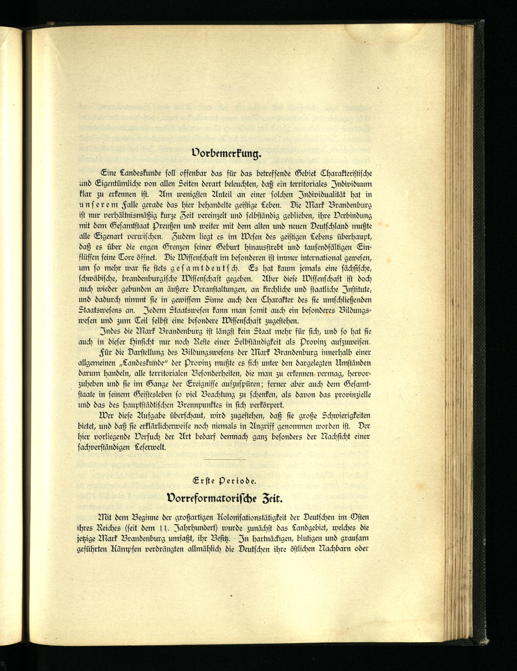 Eine Landeskunde soll offenbar das für das betreffende Gebiet Charakteristische und Eigentümliche von allen Seiten derart beleuchten, daß ein territoriales Individuum klar zu erkennen ist. Am wenigsten Anteil an einer solchen Individualität hat in unserem Falle gerade das hier behandelte geistige Leben. Die Mark Brandenburg ist nur verhältnismäßig kurze Zeit vereinzelt und selbständig geblieben, ihre Verbindung mit dem Gesamtstaat Preußen und weiter mit dem alten und neuen Deutschland mußte alle Eigenart verwischen. Zudem liegt es im Wesen des geistigen Lebens überhaupt, daß es über die engen Grenzen seiner Geburt hinausstrebt und tausendfältigen Einflüssen seine Tore öffnet. Die Wissenschaft im besonderen ist immer international gewesen, um so mehr war sie stets ges amtdeuts ch. Es hat kaum jemals eine sächsische, schwäbische, brandenburgische Wissenschaft gegeben. Aber diese Wissenschaft ist doch auch wieder gebunden an äußere Veranstaltungen, an kirchliche und staatliche Institute, und dadurch nimmt sie in gewissem Sinne auch den Charakter des sie umschließenden Staatswesens an. Jedem Staatswesen kann man somit auch ein besonderes Bildungswesen und zum Teil selbst eine besondere Wissenschaft zugestehen.