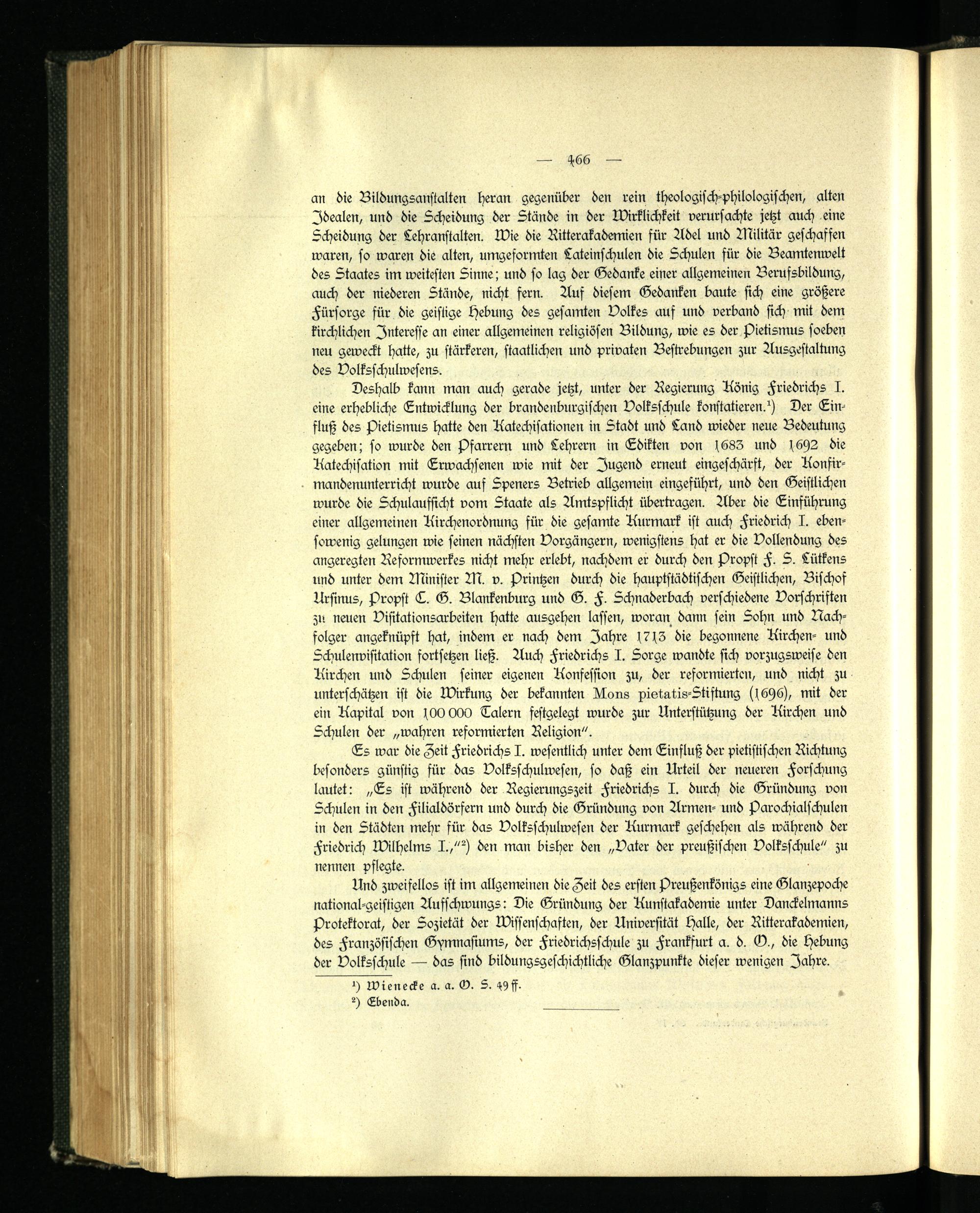 Und zweifellos ist im allgemeinen die Zeit des ersten Preußenkönigs eine Glanzepoche national-geistigen Aufschwungs: Die Gründung der Kunstakademie unter Danckelmanns Protektorat, der Sozietät der Wissenschaften, der Universität Halle, der Ritterakademien, des Französischen Gymnasiums, der Friedrichsschule zu Frankfurt a. d. M., die Hebung der Volksschule — das sind bildungsgeschichtliche Glanzpunkte dieser wenigen Jahre.
