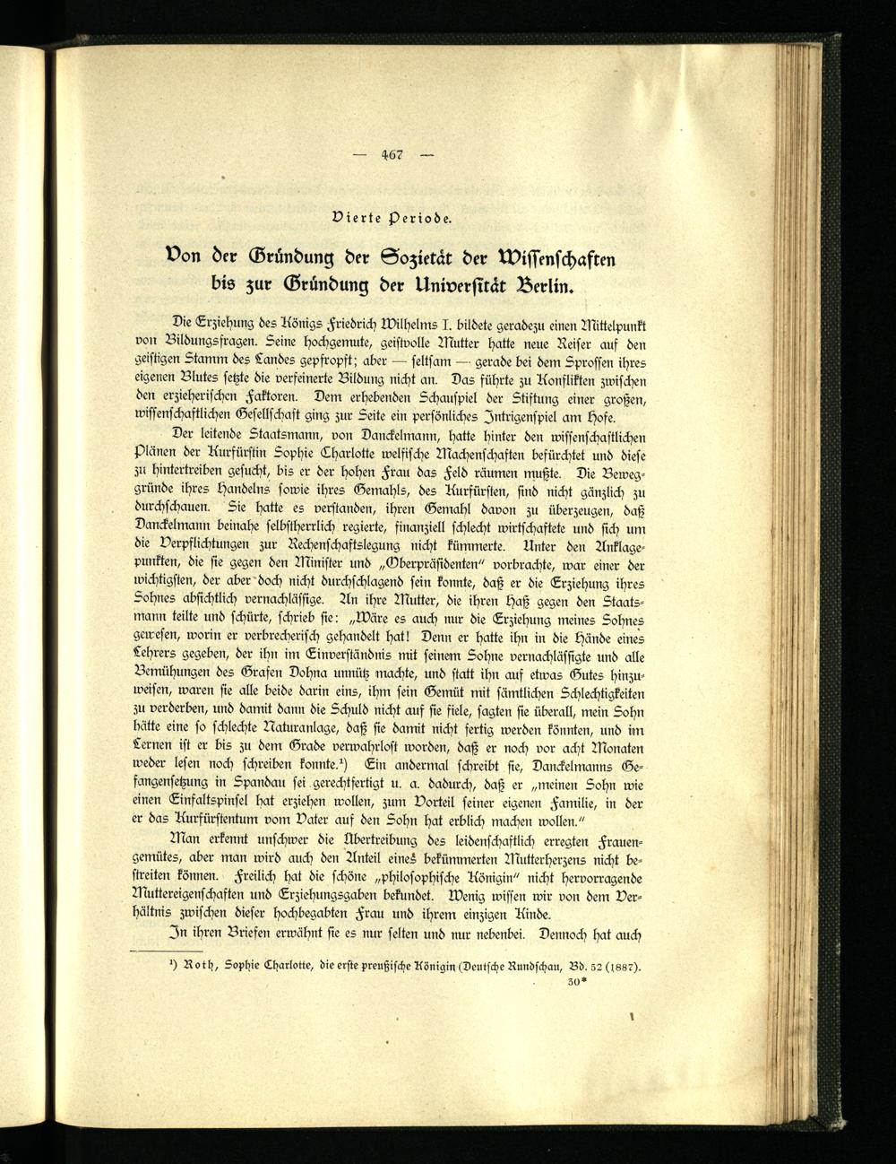 Die Erziehung des Königs Friedrich Wilhelms I. bildete geradezu einen Mittelpunkt von Bildungsfragen. Seine hochgemute, geistvolle Mutter hatte neue Reiser auf den geistigen Stamm des Landes gepfropft; aber — seltsam — gerade bei dem Sprossen ihres eigenen Blutes setzte die verfeinerte Bildung nicht an. Das führte zu Konflikten zwischen den erzieherischen Faktoren. Dem erhebenden Schauspiel der Stiftung einer großen, wissenschaftlichen Gesellschaft ging zur Seite ein persönliches Intrigenspiel am Hose.