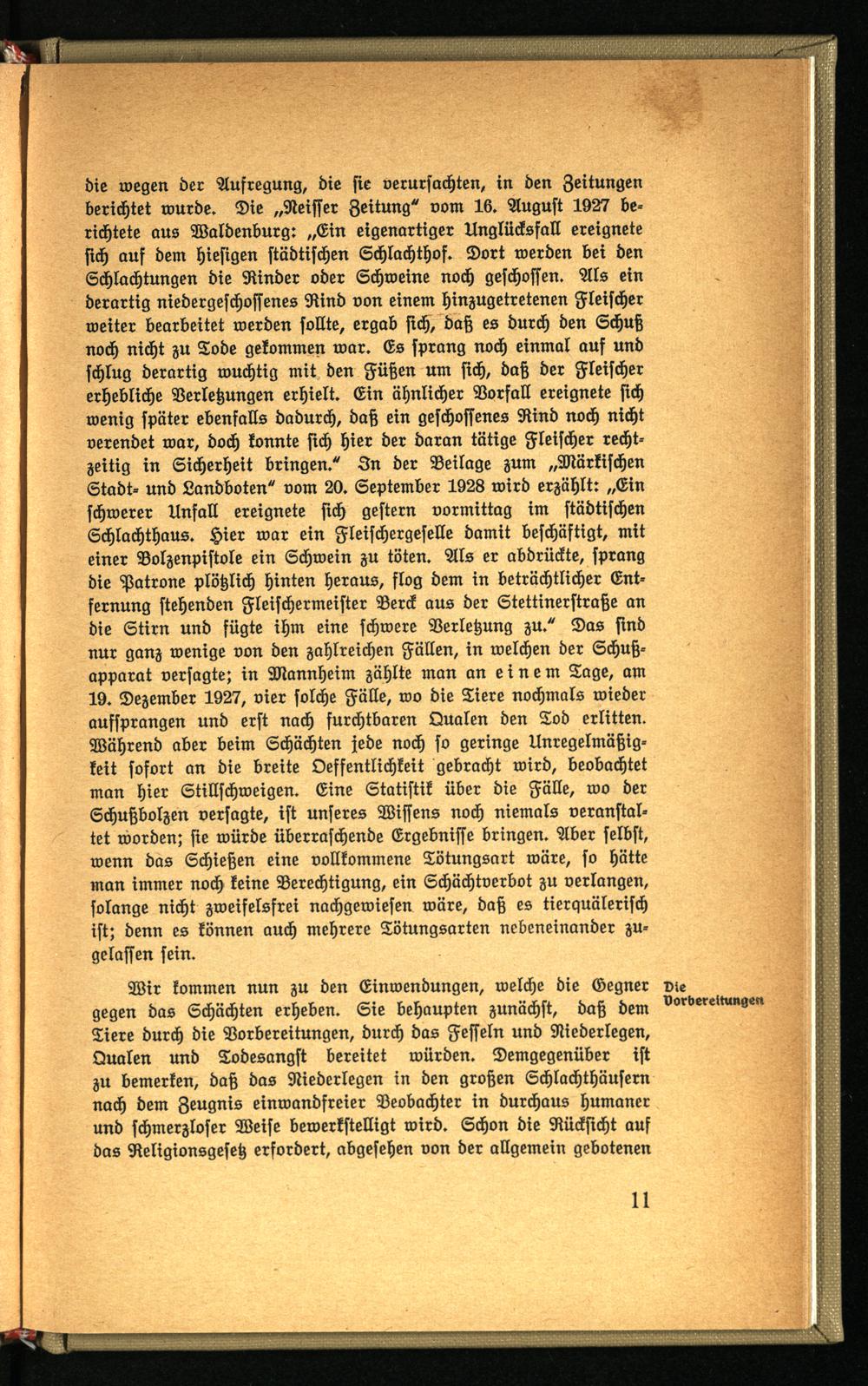 Wir kommen nun zu den Einwendungen, welche die Gegner gegen das Schächten erheben. Sie behaupten zunächſt, daß dem Tiere durch die Vorbereitungen, durch das Feſſeln und Niederlegen, Qualen und Todesangſt bereitet würden. Demgegenüber iſt zu bemerken, daß das Niederlegen in den großen Schlachthäuſern nach dem Zeugnis einwandfreier Beobachter in durchaus humaner und ſchmerzloſer Weiſe bewerkſtelligt wird. Schon die Rückſicht auf das Religionsgeſetz erfordert, abgeſehen von der allgemein gebotenen