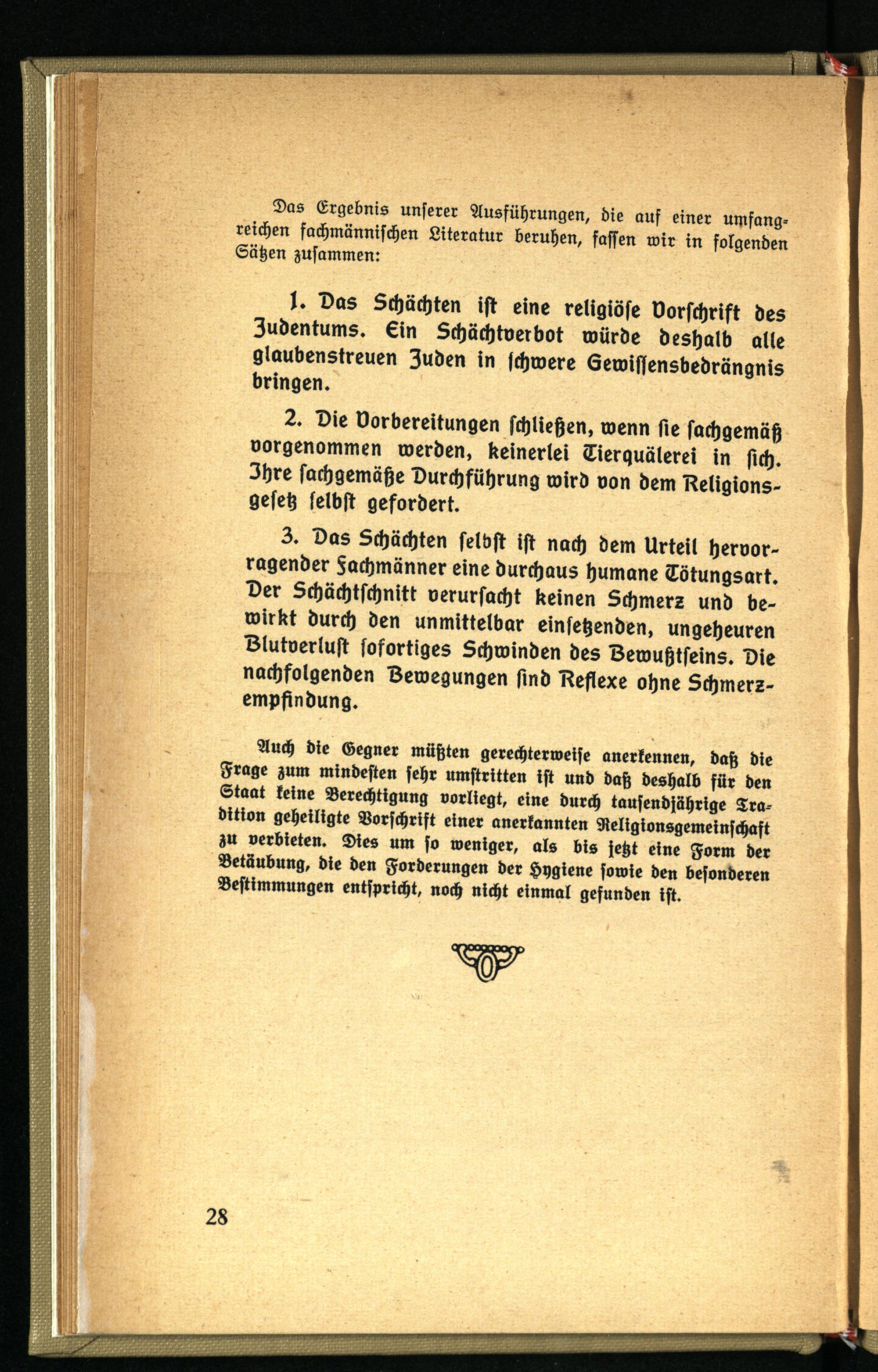 1. Das Schächten iſt eine religiöſe Vorſchrift des Judentums. Ein Schächtverbot würde deshalb alle glaubenstreuen Zuden in ſchwere Gewiſſensbedrängnis bringen.