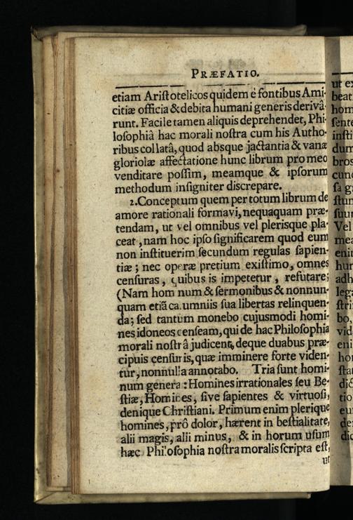 methodum infigniter discrepare. :.Conceptum quem per totum librum de amore rationali formavi, nequaquam prz iy tendam, ut vel omnibus vel plerisque pla: Ve ceat ,narn hoc ipfo fignificarem quod eum gy non inftituerim fecundum regulas fapien: tiz; nec opera pretium exiftimo, omnes cenfuras, quibus is impetetur, refutare; (Nam hom num& fermonibus& nonnur. quam etiá ca.umniis fua libertas relinquen: da; fed tant& monebo cujusmodi homi nesidoneos cenfeam; qui de hac Pbilofophia vi morali noftrà judicent, deque duabus pra. eni cipuis cenfir is, qua: imminere forte viden- ho £àür;noniüllaannotabo, Triafunthomk ff num genera: Hominesirrationales feu Be- T ftiz;; Homites; five fapientes& virtuofi,& denique Chriftiani. Primum enim plerique homines;pró dolor, herent in beftialitate; alii magis; alii minus ,..& in horum ufum hac. Phi'ofophia noftramoralisfcripta eft; E