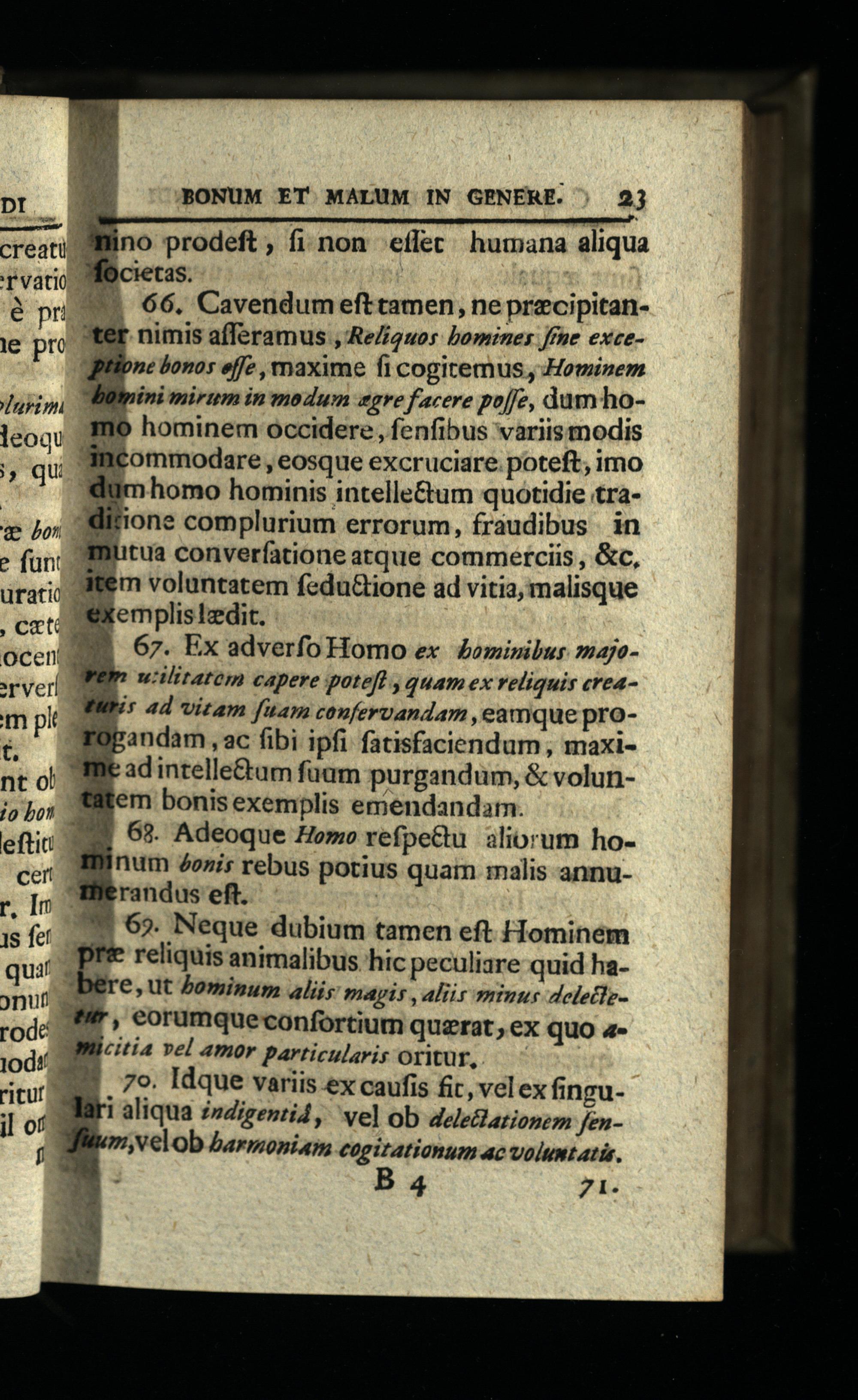 no prodeft, fi non eflec humana aliqua cietas. 66. Cavendum efttamen, ne precipitanr nimis afferamus, Re/iquos bomines fne excene bonos effe, maxime fi cogitemus Hominem ini mirum in modum sgre facere poe, dumhohominem occidere, fenfibus variismodis ancommodare, eosque excruciare. poteft, imo a homo hominis intelle&um quotidie traione complurium errorum, fraudibus in amuitua converfatione atque commerciis,&c, atem voluntatem fedu&ione ad vitia, malisque templis ledit. 67. Ex adverfo Homo ex Zeminibur majouilitatom capere potefl, quam ex reliquis erea