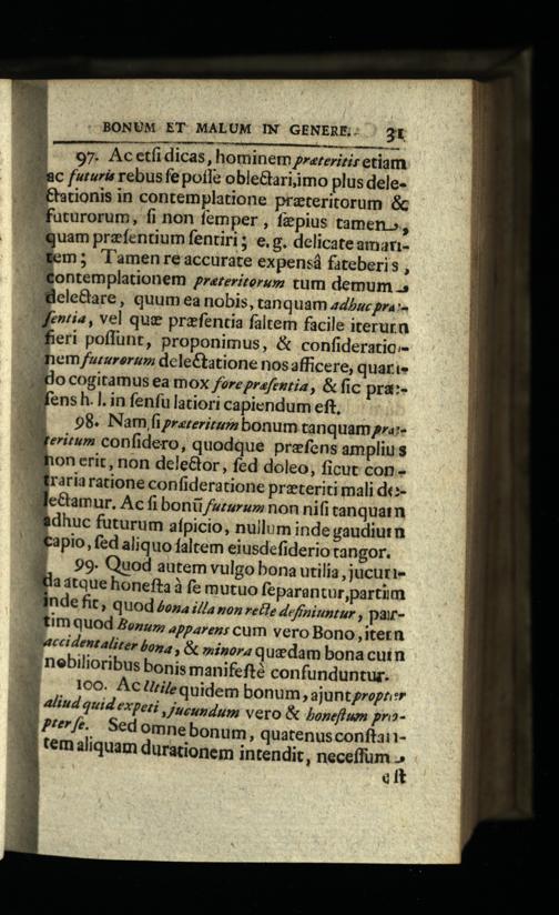 97. Acetfidicas hominem grateritis etiam € futuris rebusfe pofle obleGariiimo plus deleationis in contemplatione prateritorum&c uturorum, fi non femper, fzepius tamen», gguam przfentium fentiri; e.g. delicate amanJEem;"Tamenre accurate expensá fateberis; ontemplationem rereritorug tum demum.5 "WeleBare, quum ea nobis, tanquam zdbuc pra "entia, vel que prefentia faltem facile iterura Jferi poffunt, proponimus,& confideratic.mem fururerum dcleCtatione nos afficere, quari0 cogitamus ea mox fere prafentia,& fic prá:ens h.l. in fenfu latiori capiendum eft,