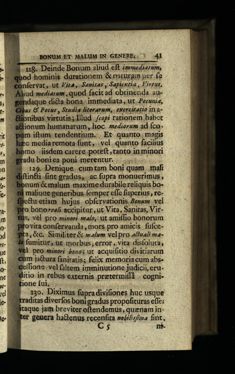 iini ibl Ms oai n8. Deinde Bonum aliud eft i»aediarum, "bod hominis durationem& rraruram per(a "€onfervat, ut /4t4, Sanitas, Sapientia, Virtus, liud;ediarum, quod facit ad obtinenda audaque dicta bona. immediata, ut. Pecunia, us& Potus, Studia literarum, exercitatio in alipnibus virtutis; Illud./zop? rationem habet a&ionum humanarum hoc. zedierum ad fco: pum iftum. tendentium.. Et quanto| magis uec mediaremota fant,. vel. quanto facilius Jhómo iisdem carere poteft; canto in minori gradu boni ea poni merentur. 1 129. Denique. cum tam boni quam mali liftin&i fint gradus, ac fupra monuerimus, bonum& malum maxime durabile reliquis bomaliaue generibus femper effe fuperius, ree&uetiam hujus. obfervationis Bersm. vel JBro bonoreaii accipitur, ut Vita, Sanitas, Virfüs, vél pro»inori mato, ut amiflio bonorum provita confervanda, mors pro amicis füfcepta,&c. Similiter& w/m velpro«uai ma12 fumitur, üt morbus, error, vita disfoluca, Wel pro minori bono; ut acquifitio divitiarum eum ja&ura fanitatis; felix memoria cum abs"eeffione vel filtem imminutione judicii, eru"itio in rebus externis pretermiffà. cognitione fui, E 150. Diximus fupra divifiones huc usque aditas diverfos boni gradus propofituras effe; taque jar breviter oftendemus, quenam iner genera haGtenus menfa nolilsfina fimt, H nt.