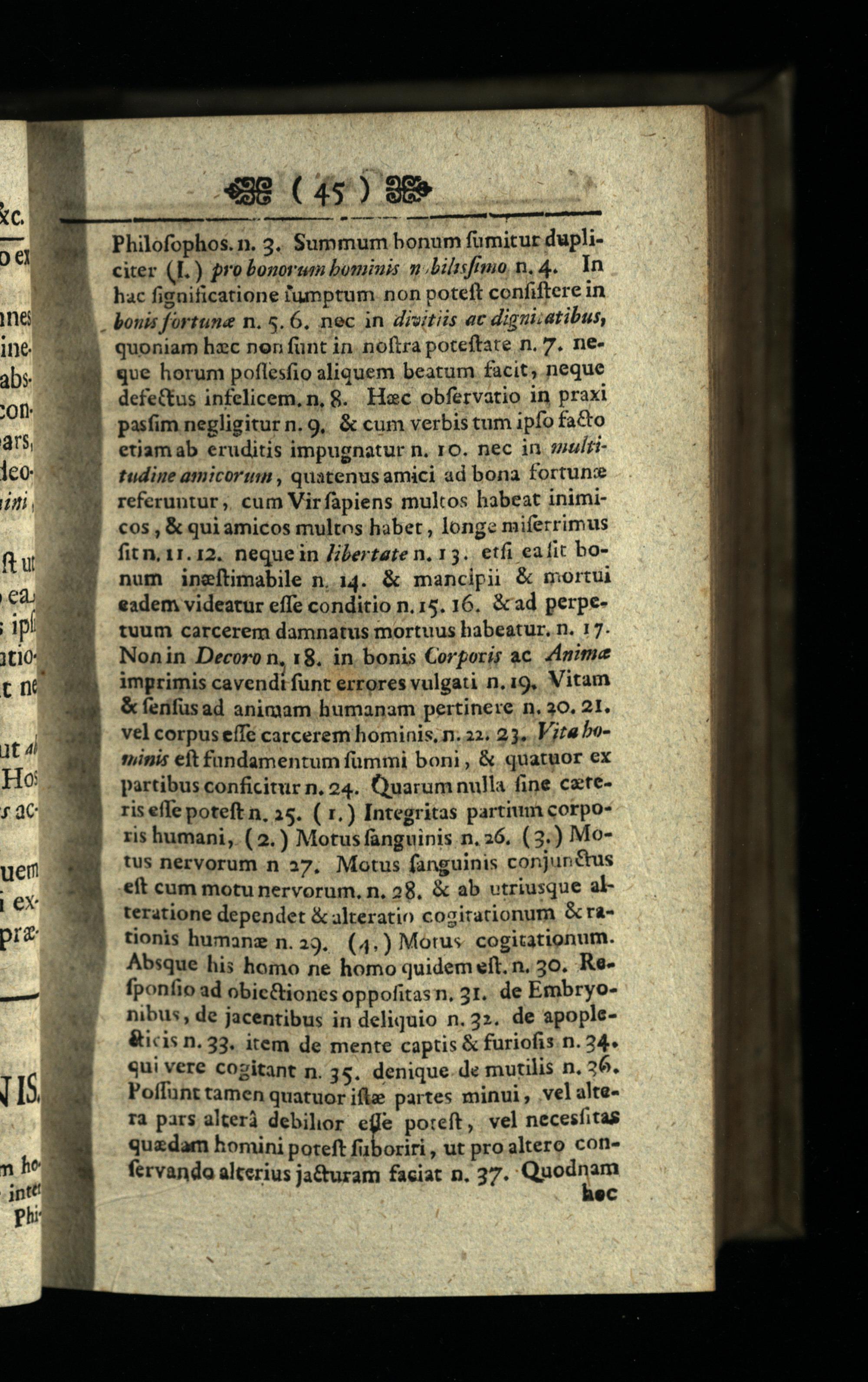 quoniam hac non fünt in. noftra poteftate n. 7. neque horum poflesfio aliquem beatum facit; neque defe&tus infelicem,n, 8. Hac obfervatio in praxi pasfim negligitur n. 9,& cum verbis tum ipfo facto etiamab eruditis impugnatur n. 10. nec in quultitudine amicormn, quatenus amici ad bona fortune referuntur;, cum Virfapiens multos habeat inimicos,& qui amicos multos habet, longe miferrimus fitn,11.12. nequein Zilertate n. 13. etfi eafit bonum ineftimabile n. 14.& mancipii& mortui eadem videatur effe conditio n.15. 16.&ad perpetuum carcerem damnatus mortuus habeatur. n. 17. Nonin Decoro n, 18. in. bonis Corporis ac Anime imprimis cavendifunt errores vulgati n.19, Vitam & ferifusad animam humanam pertinere n. 20. 21. vel corpus effé carcerem hominis, n. 22; 23. Vite botuinis eft fündamentum fümmi boni,& quatuor ex partibus conficitur n. 24. Quarum nulla fine czteris effe poteft n, 25.( r.) Integritas partium corporis humani,( 2.) Motus fanguinis n. 26.(3.) Motus nervorum n 37, Motus fanguinis conjunctus eft cum motu nervorum. n. 28.& ab vtriusque alteratione dependet& alteratio cogirationum& rationis humane n.29.(4.) Motus cogitationum. Absque his homo ne homo quidem eft. n. 30. Refponfio ad obie&iones oppofitasn, 31. de Embryonibus, de jacentibus in deliquio n. 32. de apople&icis n. 33. item de mente captis& furiofis n. 34. qui vere cogitant n. 35. denique. de mucilis n. 26. Poffunt tamen quatuor ifie partes minui, vel alteTa pars alterà debilor efe poreft, vel necesfitag quzdam homini poteft SOR, ut proaltero con