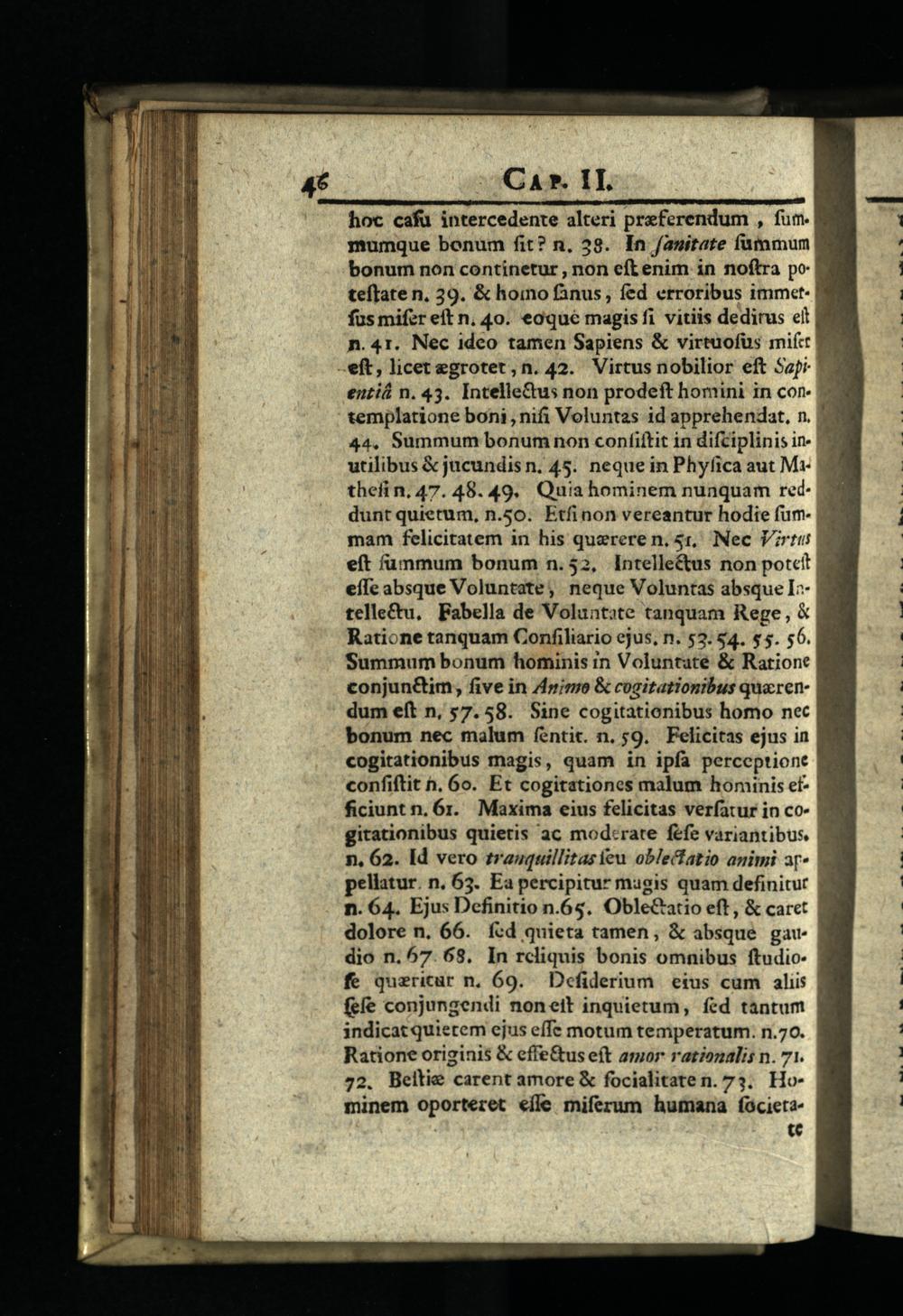 mam felicitatem in his quereren,$1, Nec Virtus eft fummum bonum n.52, Intelle&us non poteit[2 effe absque Voluntate, neque Voluntas absque I-[2 telle&u, Fabella de Voluntate tanquam Rege,& B Ratione tanquam Confiliario ejus, n. 52.$4.$5. 56.| Summum bonum hominis in Voluntaté& Ratione conjun&im, five in 717/mo& cogitationibus queren-| dum eít n, 57.58. Sine cogitationibus homo nec| bonum nec malum(fentit. n. 59. Felicitas ejus in E cogitationibus magis, quam in ipfa perceptione DX confiftit h, 6o. Et cogitationes malum honiinis ef-[2 ficiunt n. 61. Maxima eius felicitas verfatur in cogitationibus quietis ac moderate fefe variantibus n, 62. Id vero trauquillitasteu obleatio animi appellatur. n. 63. Ea percipitur magis quam definitur I2 n. 64. Ejus Definitio n.65. Oble&atio eft,& carct 1 dolore n. 66. fcd quieta tamen,& absque gau- B dio n. 67.68. In rcliquis bonis omnibus ftudiofe quericur n, 69. Defiderium| eius cum aliis| fefe conjungendi noneit inquietum, fed tantum P indicat quierem ejus effe motum temperatum. n.70.| Ratione originis& effe&us eft amor rationalis n. 71. 72. Bellie carent amore& focialitaten. 73. Hominem oporteret efle miferum humana facietae