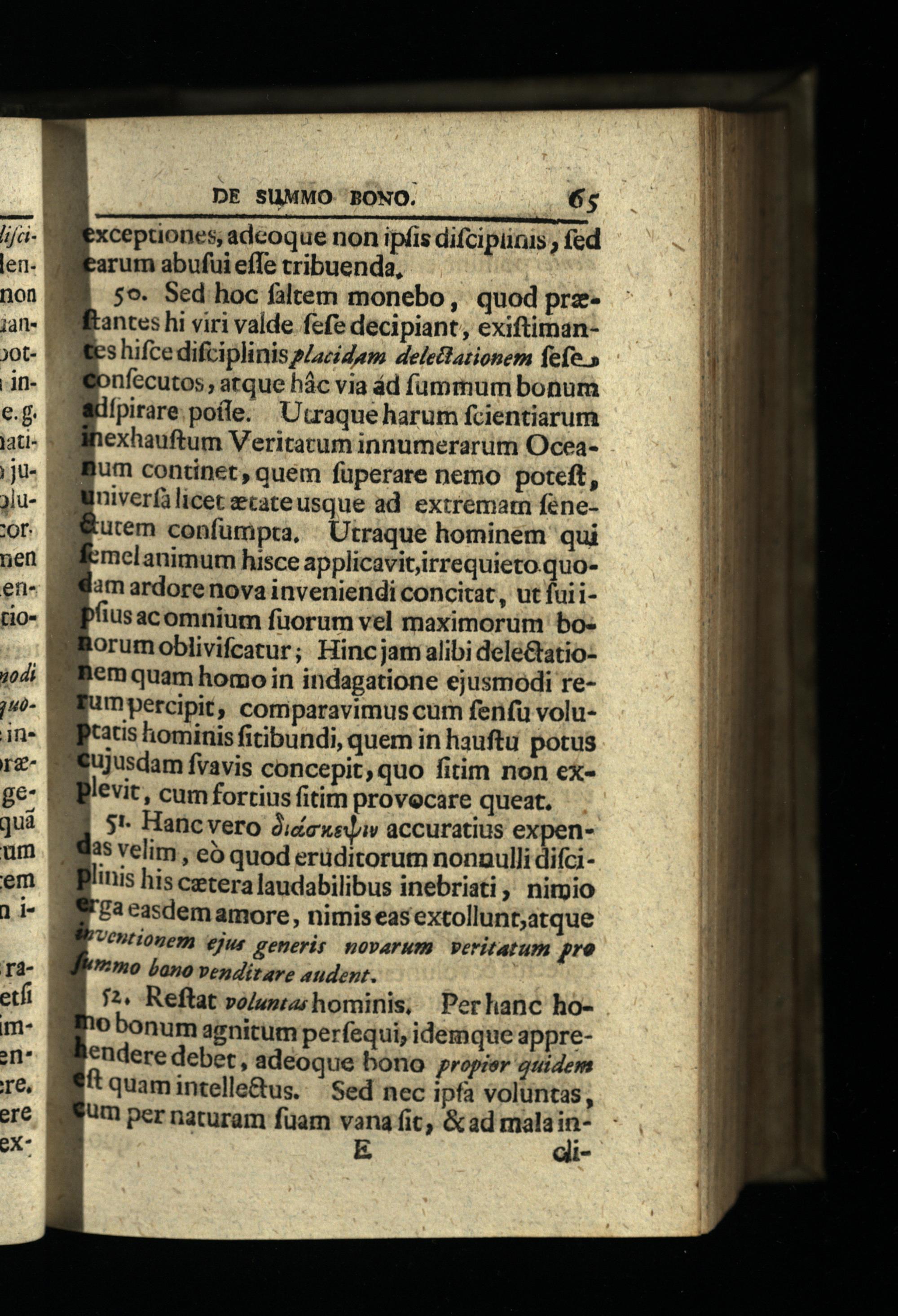 WEonfecutos, arque hác via ád fummum bonum "Wilpirare pofle. Utraque harum fcientiarum Jihexhauftum Veritatum innumerarum Ocea9Bum continet, quém füperare nemo poteft, lMniverfàlicetaecateusque ad extremam feneutem confürmipra,^ Utraque hominem qui melanimum hisce applicavitirrequieto.quoam ardorenova inveniendi concitat, ut faiifiusacomnium fuorum vel maximorum boorum oblivifcatur; Hincjam alibi dele&tatioem quam homo in indagatione ejusmodi rempercipit, comparavimus cum fenfu volutatis homiriis fitibundi, quem in hauftu potus Sujusdam fvavis concepit; quo fitim non exlevit, cum fortius fitim provecare queat.