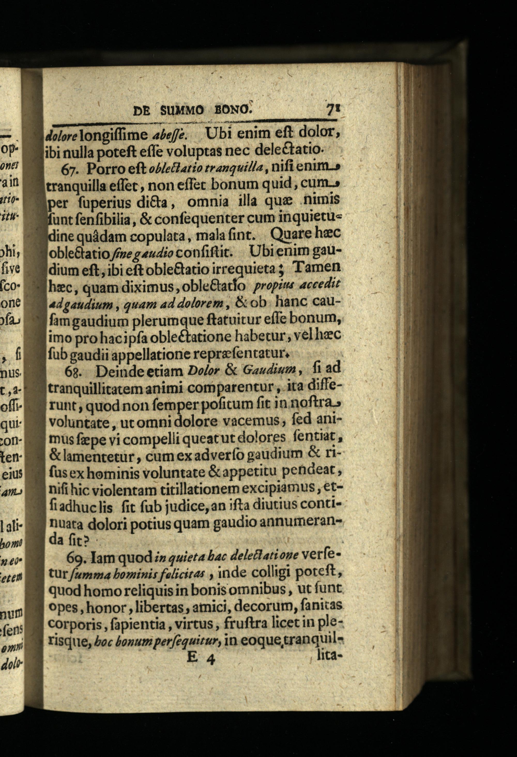 69. Iam quod;z quieta bac delelatione verfetur mma bominis felicitas, inde colligi poteft, quod homo reliquis in bonis omnibus, ut funt opes, honor, libertas, atnici, decorum, fanicas corporis, fapientia, virtus, fruftra licet in plerisque, oc Jonumperfequirur, in eoque,tranquil