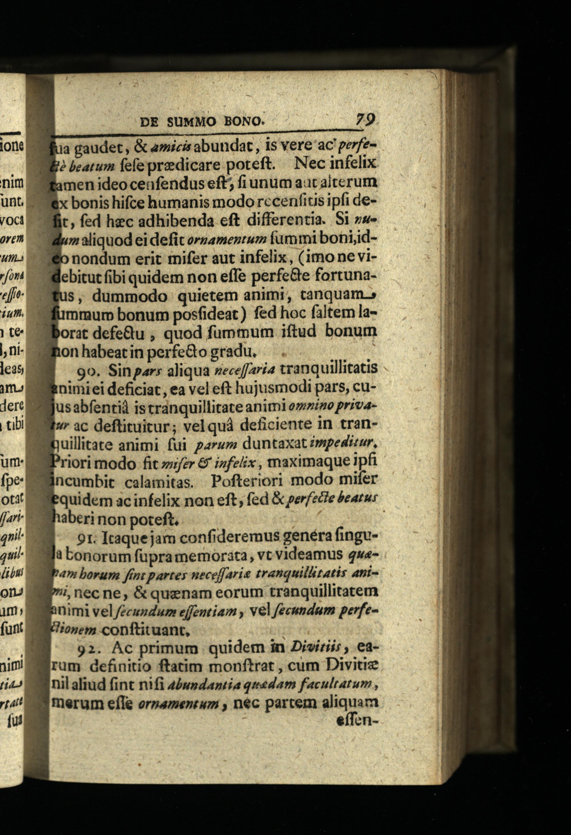 a gaudet,& amicis abundat, is vere ac! perfey? beatum fefe predicare poteft. Nec infelix amen ideocenfendus eft; fi unum aut aiterum x bonis hifce humanis modo rccenfits ipfi deflic, fed hec adhibenda cft differentia. Si»«"um aliquod ei defit ermamentum fammi boni;id3o nondum erit mifer aut infelix,(imo ne viWMebitut fibi quidem non effe perfe&e fortuna$, dummodo quietem animi, tanquam.» mmur bonum posfideat) fed hoc faltem laJborat defe&u, quod fummum iftud bonum Won habeat in perfe&o gradu. . 90. Sinpars aliqua seceffaria tranquillitatis nimiei deficiat, ea vel eft hujusmodi pars, cuusabfentid istranquillitate animi o»ino privas ac deftituitur; velquà deficiente in trannuillitate animi fui paru duntaxat impeditur, riori modo fit zifer& infelix, maximaque ipfi incumbit calamitas. Pofteriori modo mifer equidem ac infelix non eft, fed& per/zd?e beatus aberinon poteft. JM or Itaquejam confideremus genéra finguJJ bonorum fupra memorata, vt videamus qw«bam borum fint partes neceffaria tranquillitatis ani"i, necne,& quznam eorum tranquillitatem animi vel/ecundurm effentiam, vel fecundum perfejonem conftituant,