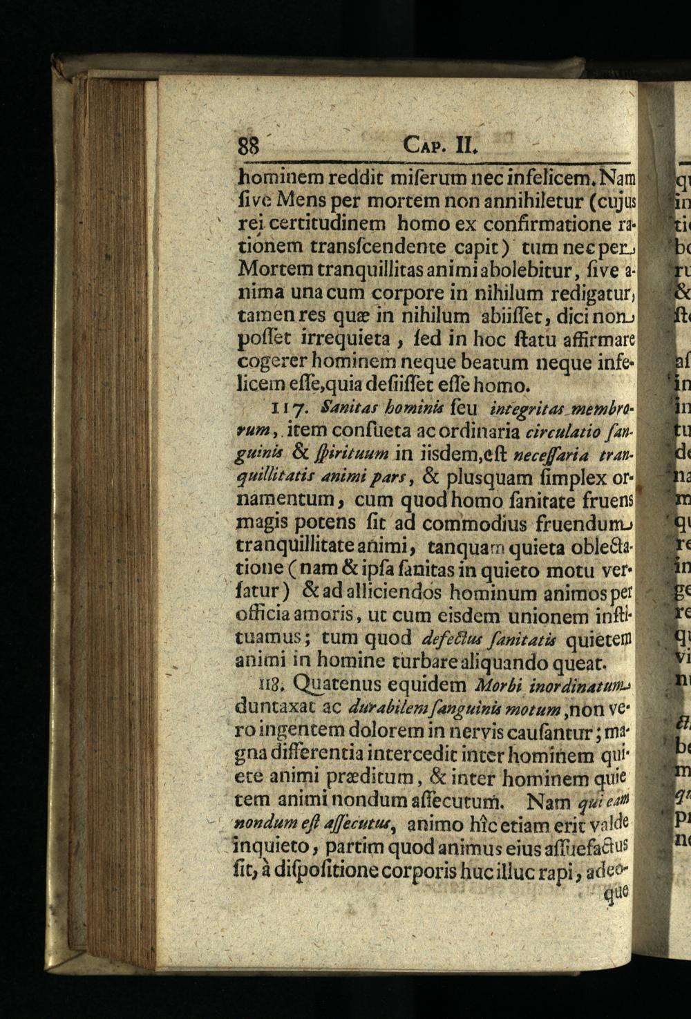 117. Sanitar bominis fou. inzegritas membro*um, item confüeta ac ordinaria eirculazio fanguinis.& firituum in iisdem,eft seceffaria tranquillitatis animi pars,& plusquam fimplex o namentum, cum quod homo fanitate fruen: magis potens fit ad commodius fruendun tranquillitateanimi, tanquam quieta oble&tz tione( nam& ipfa fanitas in quieto motu ver-[fatur)&adalliciendos hominum animos pet|: officia amoris, ut cum eisdem unionem infttuamus; tum quod Zefzcas fanitatis quietem animi in homine cürbarealiquando queat.