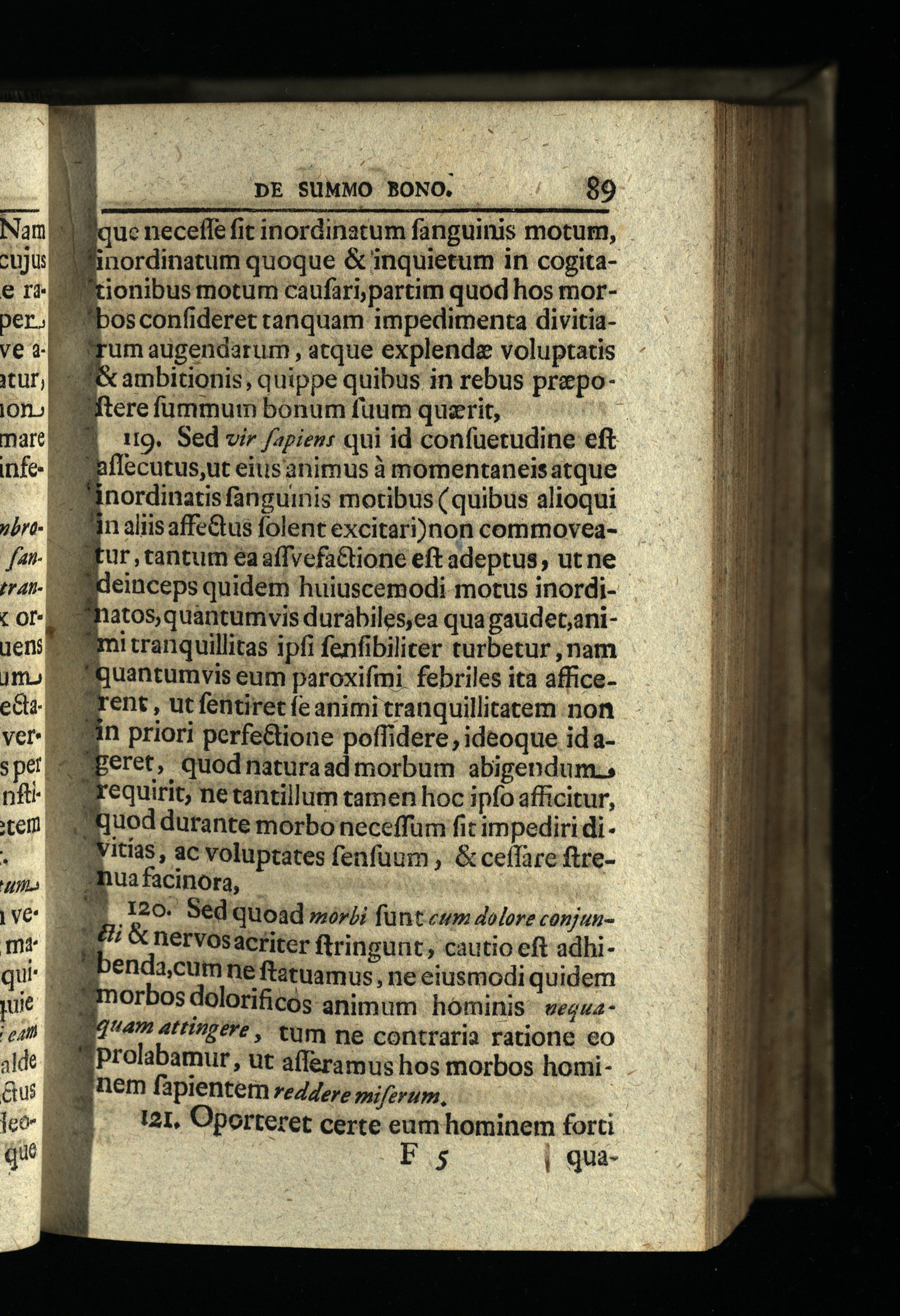 PE c2 tgo s PPS uec neceffe fit inordinatum fanguinis motum, Winordinatum quoque& inquietum in cogitationibus motum caufaripartim quod hos morosconfideret tanquam impedimenta divitiaum augendarum, atque explendze voluptatis ambitionis, quippe quibus in rebus prepoftere fummum bonum füum qusrit, | 119. Sed vir /apienr qui id confüerudine eft nffecutus,ut eiusanimus à momentaneis atque nordinatis fanguinis motibus(quibus alioqui n aliisaffe&us folent excitari)non commoveaur,tantum éaaffvefaCtioné eft adeptus, ut ne deinceps quidem huiuscemodi motus inordinatos, quantumvis duràbiles,ea quagaudet,anim! tranquillitas ipfi fenfibiliter turbetur, nam Zguantumvis eum paroxifmi febriles ita afficerent, ut féritiret fe animi tranquillitatem non in priori perfe&ione poflidere, ideoque idaperet, quod naturaad morbum abigendum., equirit; nétantillum camen hoc ipfo afficitur, uod durante morbo neceffum fit impediri di Vitis, ac voluptates fenfüum,& ceffare ftrehuafacinora,| 120. Sed quoad»»ii fünt ewm dolore conjun7& nervosactiter ftringunt, cautio eft adhibenda,cumne ftstuamus, ne eiusmodi quidem orbos dolorificós animum. hominis: veguaL4 4ITP/296, tum ne contraria ratione eo prolabamur, ut afferamus hos morbos homi"nem fapientem reddere miferum, 121, Oporteret certe eum hominem forti Fs| qua