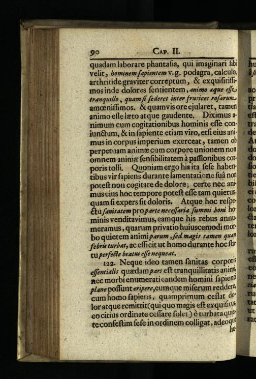 mme mme amans cabesiost b et mss pen ce cann trou umatom TAMEN EE ERES quadam laborare phantafia, qui imaginari íib velit, bominem fapientem v.g. podagra, calculo, arthritidegraviter correptum,& exquifiriffi mosinde dolores fentientem, animo«que effe: tranquillo, quam f ederet inter frutices rofarun., amceniffimos.& quamvisore ejularet, camen animoeflelzto atque gaudente. Diximus« nimum cum cogitationibus hominis effe con. iun&um,&in fapiente etiam viro, etfi eius animus in corpus imperium exerceat, tamen oj perpetuam animz cum corpore unionem non omnem anime fenfibilitatem à paffionibus corporistolli. Quoniam ergo hisita fefe haben: tibus vir fapiens durante lamentadone fuà nor poteftnon cogitare de dolore; certe nec any museius hoctempore poteft effe tam quietus: quamfi expers ficdoloris, Atque hoc refpetGu /anitatem pro parte nece[Jaria fummi boni ho! minis venditavimus, eamque his rebus ann meramus, quarum privatio huiuscemodi mo" bo quietem animi parum ,fed magir tamen quA! febris turbatyac efficituc homo durante hocft*'| tu perfetle beatus effe nequeat. 122. Neque ideo tamen fanitas corpor: effemialis quidam pars eft vranquillitatis anim nec morbienumerati eandem homini fapier" plane pollünteripere,eurnque miferum reddere cum homo fapiens, quamprimum ceffat d' loratqueremittit(qui quo magis eft exquifiti eocitius ordinate ceffare folet) é vurbata quie teconfeftim fefe in ordinem colligat, adeod" ^