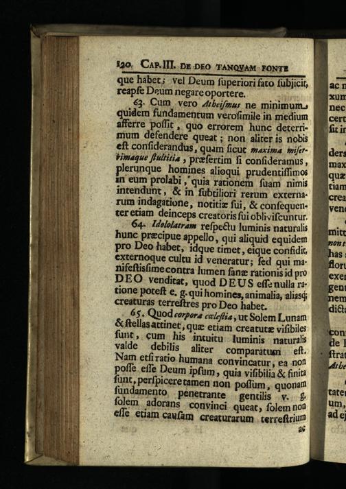 lerunque homines alioqui. prudentiffimos in eum prolabi,'quia rationem fuam nimis intendunt,& in fübriliori rerum externarum indagstione, notitiz fui,& confequenteretiam deinceps crestoris fui oblivifcuntur. «64». Idelolatram refpc&tu luminis naturalis D hunc precipue appello, qui aliquid equidem E pro Deo habet, idque timet, eique confidi, S externoque cultu id veneratur; fed qui ma nifeftisfime contra lumen fanz rationis id pro DEO venditat, quod DEUS eff:nulla r2 tione poteft e, g. qui homines, animalia, alias; creaturas terreftres pro Deo habet.