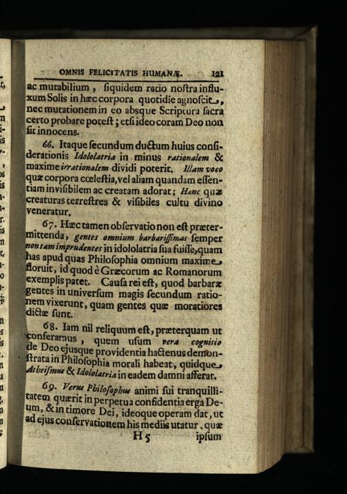 ac mutabilium,. fiquidem rario noftra influ-. xumSolis in heccorpora quotidie aunofcit 5, nec mutationemin eo absque Scriptura facra Ju certo probare poteft; etfiideo coram Deo non | fit innocens. |. 66, Itaquefecundum ductum huius confiderátionis Zdo/oZerria in minus rwrianalem& maxime j/rarionalem dividi poterit, J//am voso quz corpora cceleftia,vel aliam quandam effentiam invifibilem ac creatam adorat; Hac qua tTeaturasterreftres& vifibiles cultu divino veneratur, .. 67. Hectamenobfervationon eft pratermittenda, gewres omnium. barbarifFrnas femper on tam imprudentes jn idololatria fua fuiffe, quam as apud quas Philofophia omnium maxime.» oruit; id quod é Grecorum ac Romanorum xemplispatet. Caufa reieft, quod barbarz )pentes in univerfum magis fecundum ratiomem vixerunt, quam gentes que moratiores ?dictz fünt.: 68. Iam nil reliquum eft, preterquam ut Dnferarus, quem ufum rera cognitio Deo Sjusque providentia ha&enus denfonratain P llofophia morali habeat, quidque, drbeifpmue& Idololaty;ain eadem damni afferat, G9. Perte Philofoppus animi füi tranquillitatem querit in perpetua confidentia ergaDeum,&intimore Dei, ideoque operam dat, uc ad ejus conferyationem his mediis utatur, que H5 ipfum