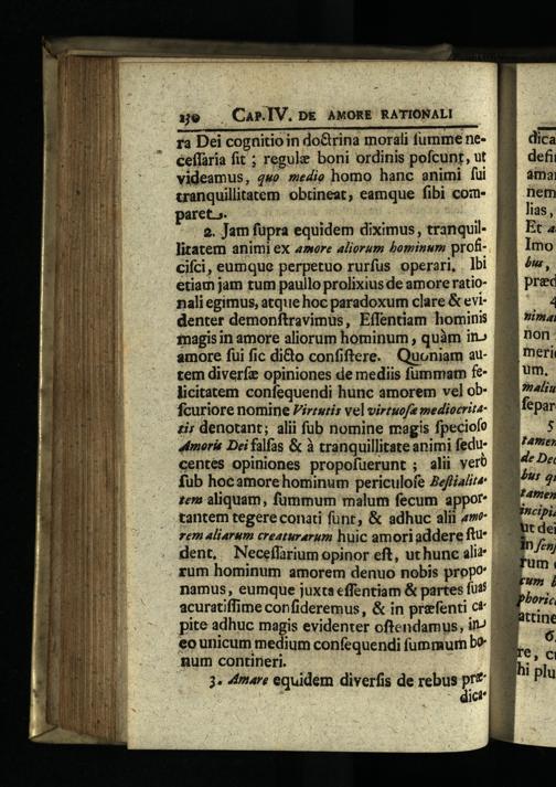 2. Jam fupra equidem diximus, tranquil- PF litatem animi ex 4zre aliorum bominum profi-. E cifci, eumque perpetuo rurfus operari, lbi D etiam jam tum paullo prolixius de amoreratio- 2 nali egimus, atque hoc paradoxum clare&evi-— denter demonftravimus, Effentiam hominis p 1nagis in amore aliorum hominum, quàm in» 2 amore fui fic dido confiftere. Quoniam au- 2 tem diverfe opiniones de mediis fummam fe licitatem confequendi hunc amorem vel ob fcuriore nomine 7irrutis vel virtuofa mediocri zi; denotant; alii füb nomine magis fpeciofe| 4tmoris Dei falfas& à tranquillitate animi fedu: centés opiniones propofuerunt; alii vert| fub hocamore hominum periculofe 2effia/i4 zers aliquam, fummum malum fecum appor tantem tegere conati funt,& adhuc alii 4"? rem liarum creaturarum huic amori addere ftu dent, Neceflarium opinor eft, uc hune ali rum hominum amorem denuo nobis propo| namus, eumque juxta effentiam& partes futi| acuratiffime confideremus,& in preefenti c&'| pite adhuc magis evidenter oftendamus, it| eounicum medium confequendi fummum be' num contireri.